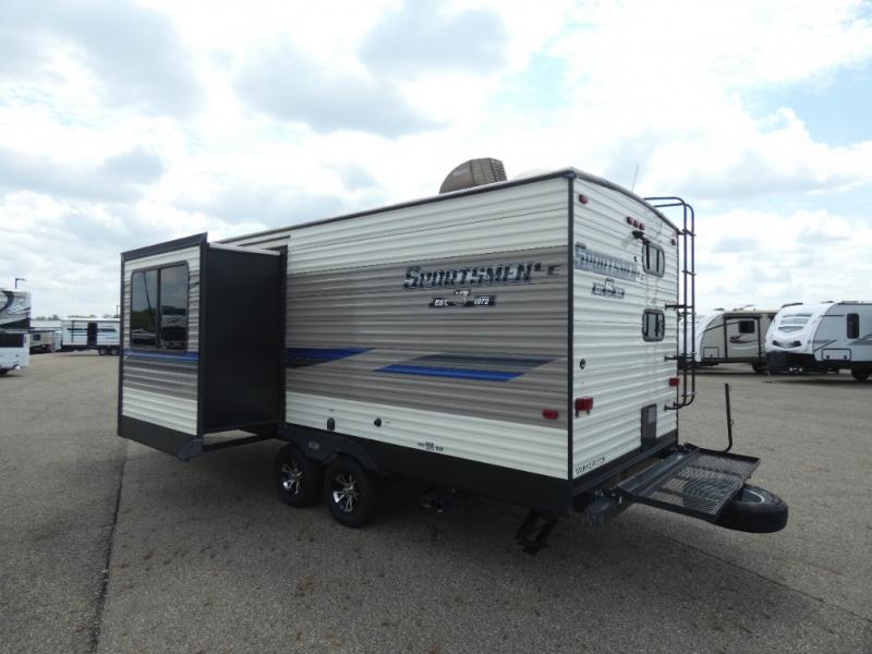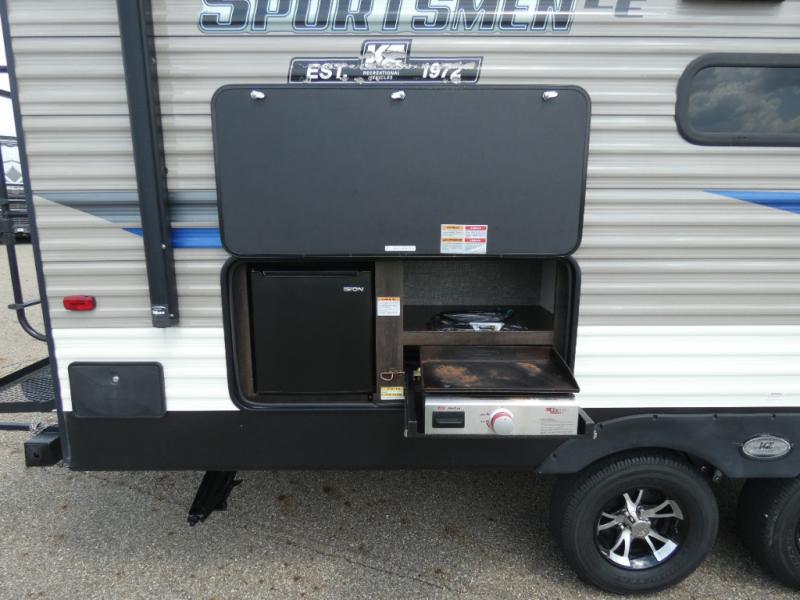 With any KZ Sportsmen LE travel trailer or toy hauler, you will be able to extend your camping season thanks to the optional Climate Package, which includes an insulated and enclosed underbelly. The new aerodynamic front profile with a smooth metal front will not only be eye-catching, but will help save on fuel mileage as you travel to your destination and you'll appreciate the flip-up solid entry steps that provides sturdy access into your unit. Each model features a power awning with LED lights, exterior speakers with LED lights, and a lighted power tongue jack with a hitch light for easy set-up every time. Inside, you'll enjoy many comforts and conveniences, like the king bed mattress, the dinette doors 36" pullout storage bins in the travel trailers, two 6.5" interior speakers, and the multi-media sound bar stereo with Bluetooth, HDMI and USB charge. Choose your favorite layout today and start camping tomorrow!