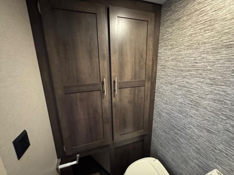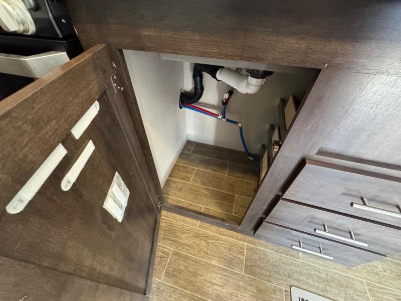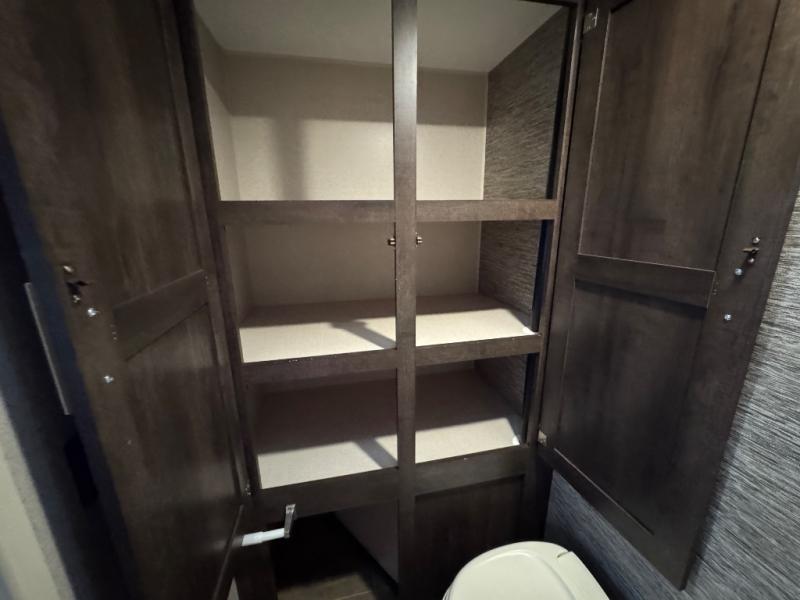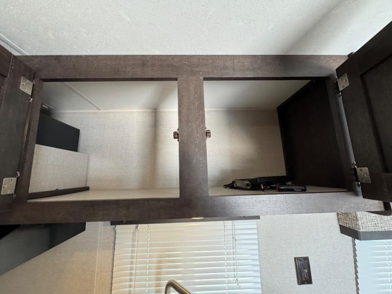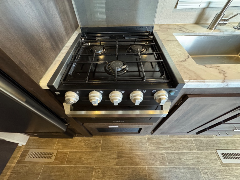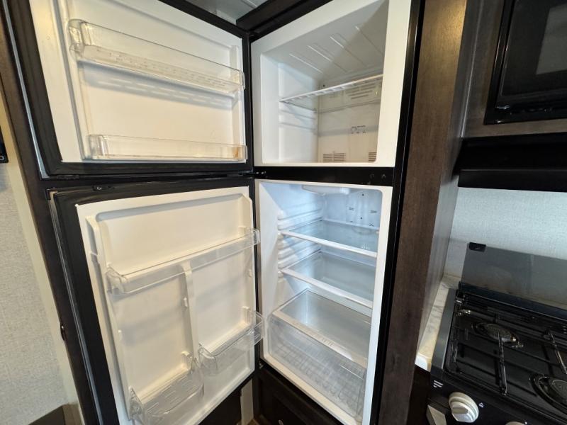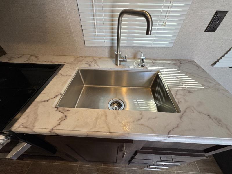 You can make warm meals in the microwave that includes a turntable or use the drop-in cooktop with glass cover or the oven. And the large kitchen sink makes cleaning up easy. The dinette and 64" sofa offer a place to relax inside or even sleep if your kiddos or friends want to stay the night. Then you can retreat to your own private front bedroom. You will find the pass-through storage allows you to bring along those larger camping items, and the 14' power awning offers an outdoor living area covered from the direct sunlight.