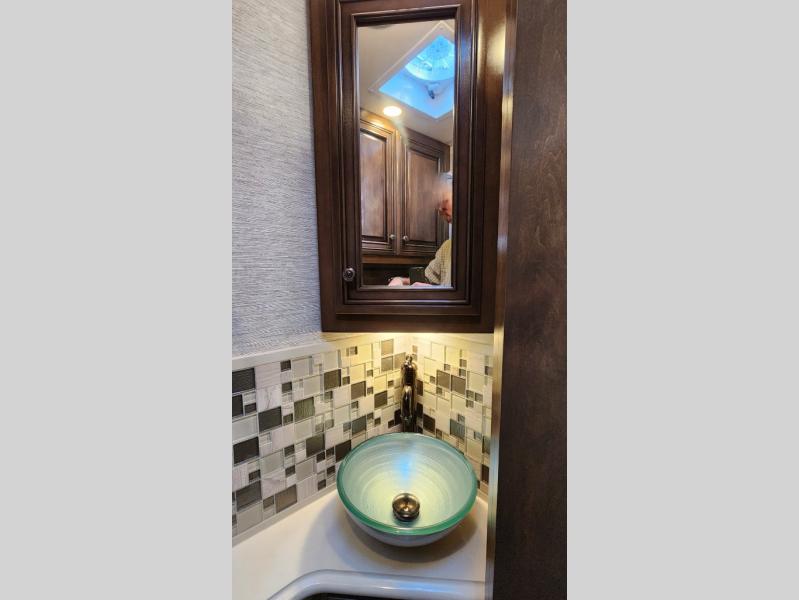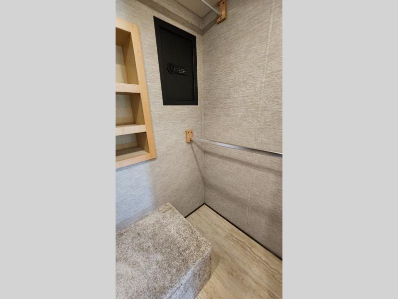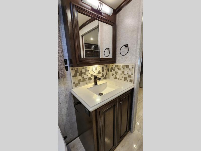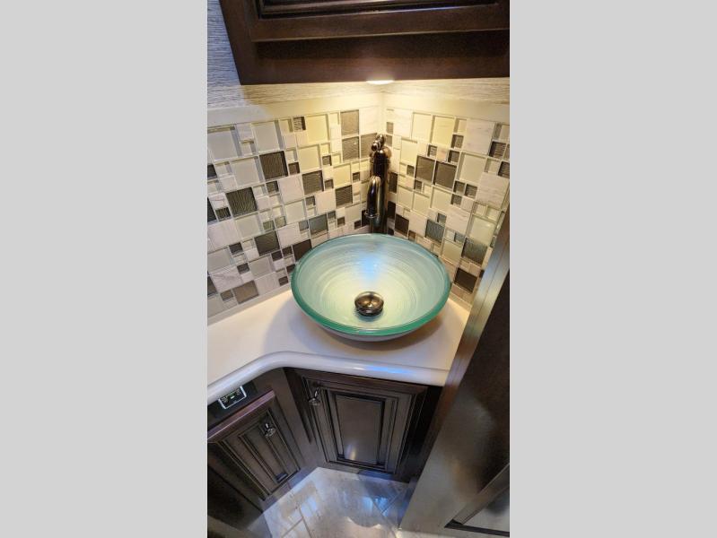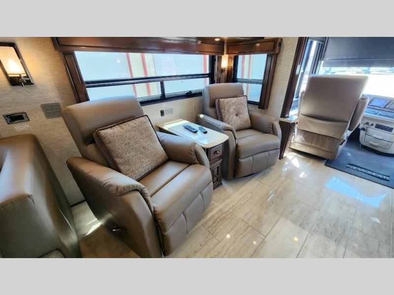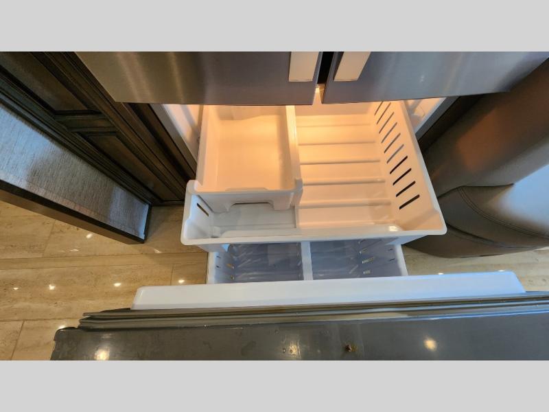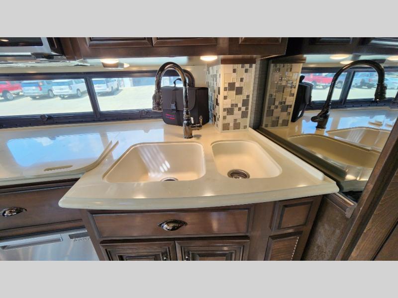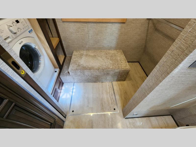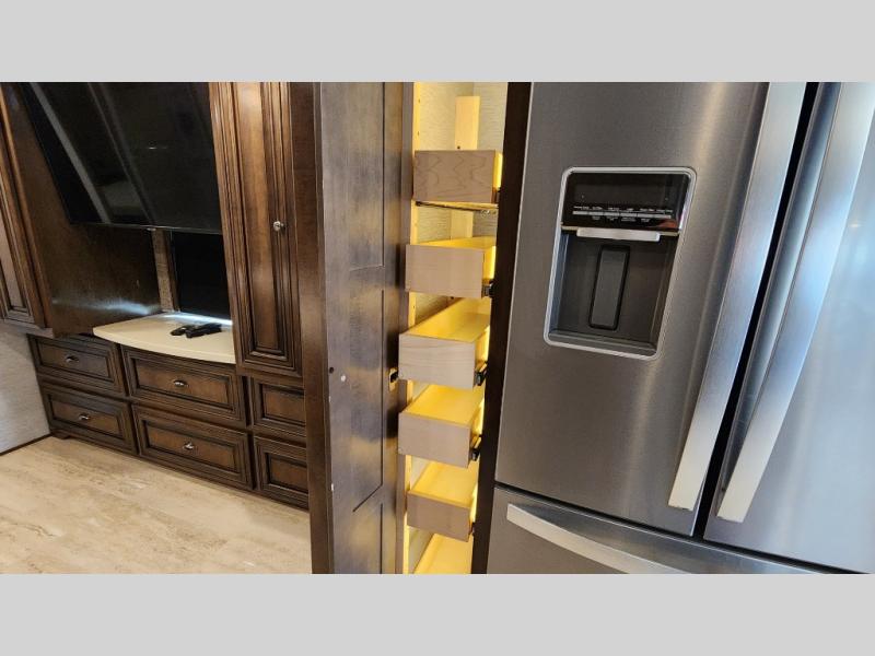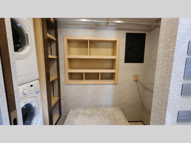 From a spacious interior with three slide outs throughout, plenty of wardrobe storage, and exterior compartments to the comfortable sofas and a king bed, you will enjoy living in this coach or traveling for long periods of time. You might even add the washer/dryer option to the rear bathroom's walk-in closet as an added convenience. The half bath will come in handy when you have guests over, and the kitchen will allow you to cook in a convection microwave or on a recessed gas cooktop. The 19 cu. ft. refrigerator, the pull-out cabinet and the pantry offer plenty of space for your food and such. You will also like the appliance garage feature. Start traveling today! This model also offers the option to choose a Spartan K2 tag axle in place of the standard chassis.