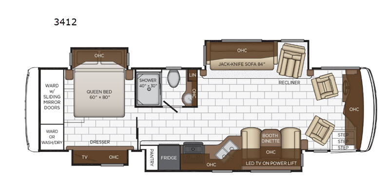 This is just the motorhome you've been looking for with tons of interior space and comfortable furniture. After traveling all day to your destination and setting up camp, prepare lunch on the three burner range or in the convection microwave. This model features a jack-knife sofa and a recliner that sit directly across from the LED TV so you can enjoy your favorite shows wherever you go. The rear bedroom with a queen bed will provide a great night's rest and here you'll find plenty of storage space, including a wardrobe with sliding mirrored doors, a dresser, and overhead compartments. There has even been a place prepped for you to a washer and dryer if you choose!