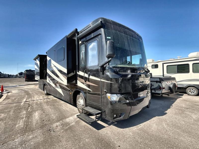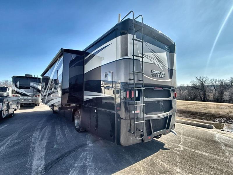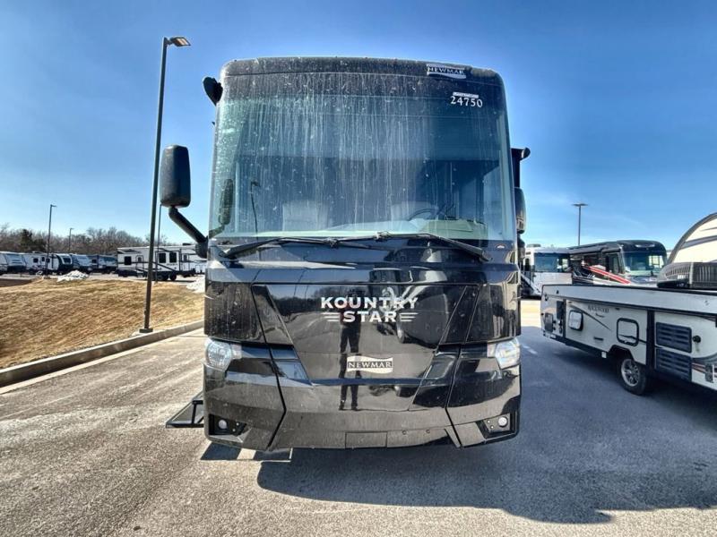 With each Kountry Star Class A diesel motorhome by Newmar you'll find luxurious interior features such as Flexsteel Delux furniture, grouted vinyl tile flooring in the kitchen, bath, and living area, and LED recessed ceiling lights for true comfort and convenience. The 30" over-the-range stainless steel convection microwave and the Norcold 10 cu.ft. stainless steel refrigerator, along with the polished solid surface countertops will allow you all the amenities and space you need to prepare meals every day while you are away from home. These motorhomes include many exterior features, such as lighted exterior storage compartments, an exterior shower, electric awnings with LED lights, plus so much more. With all of these features, you'll be surprised to hear the Kountry Star is Newmar's most affordable diesel coach yet, so choose your favorite layout today!