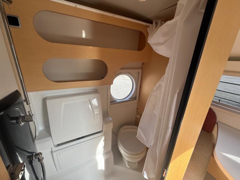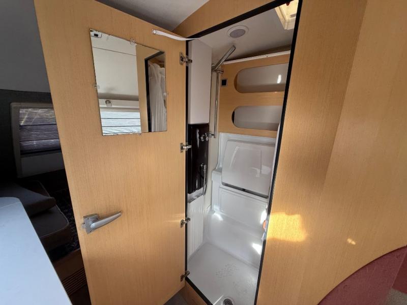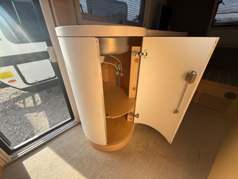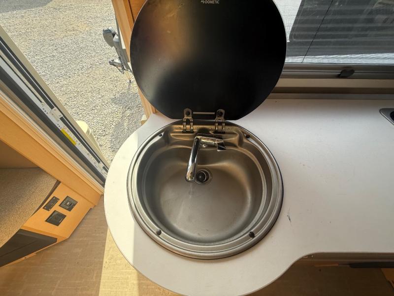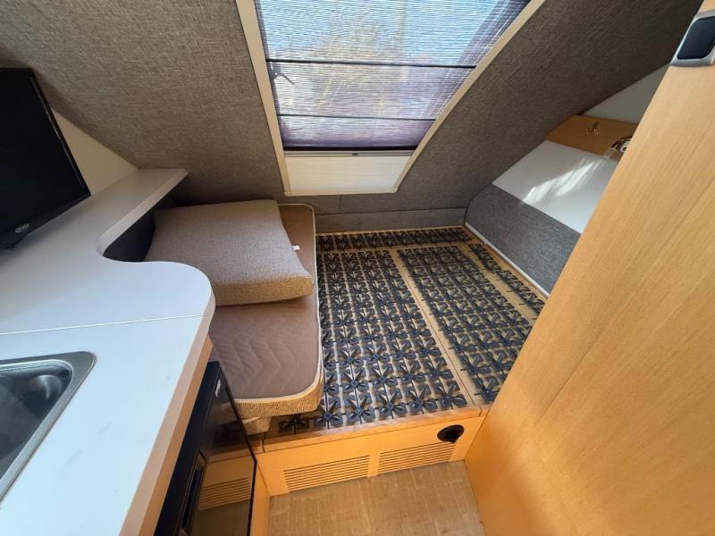 Easy to tow and clean, this teardrop trailer will have you scheduling all your camping excursions for the year! You will have your own queen-size bed while your little one can sleep on the second sleeping area that is converted from two seats and a dining table. Everyone can stay clean and refreshed after hiking the trails thanks to the wet bath with fold-down sink. You can make meals inside on the two-burner stove and store your leftovers in the two-way fridge. At night be sure to look out the front window at the stars and enjoy the central air conditioning or the central heat depending on the season.