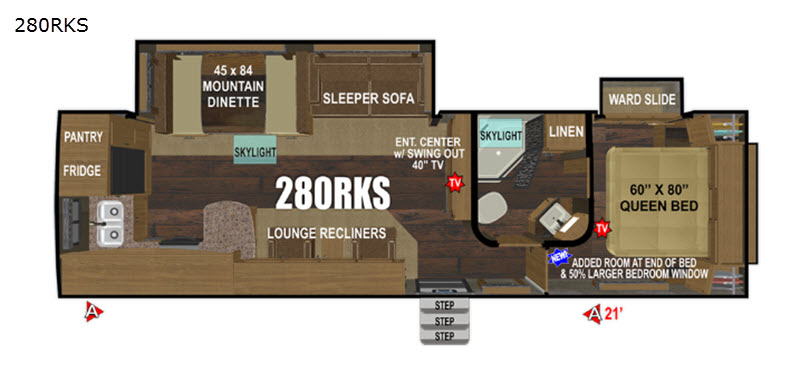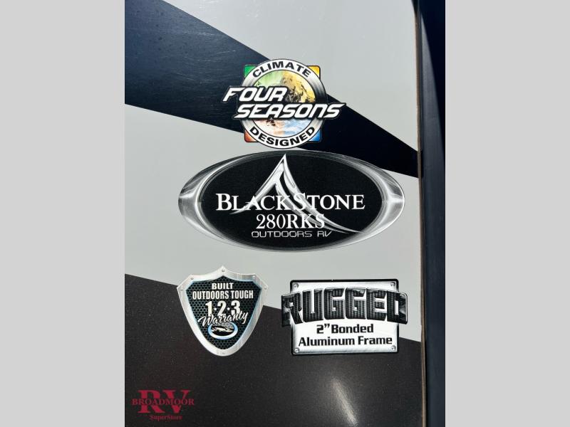 Hitch up this Black Stone 280RKS travel trailer to your favorite tow vehicle and start exploring your state. You will enjoy plenty of floor space with the large slide out in the living/dining area and the placement of the rear kitchen. Inside the front private bedroom, you can relax on the queen bed with the additional added space while you watch your favorite movie on the TV and keep your room tidy with the wardrobe slide out. Your whole group can enjoy watching a show together on the swing out 40" TV while relaxing on either the sofa sleeper or one of the two recliners, and if you're not one for shows then you can head to the mountain dinette and play a card game while you enjoy a snack. What are you waiting for, stop stalling and start a new adventure today!