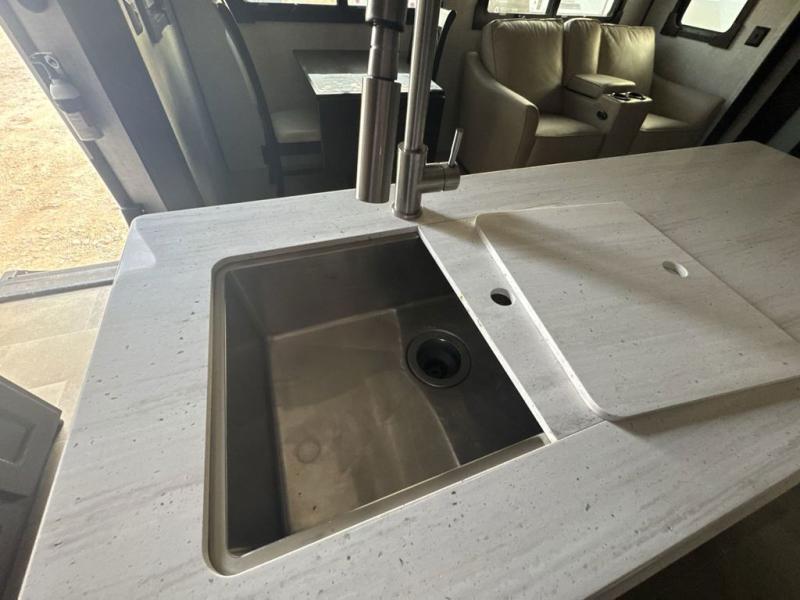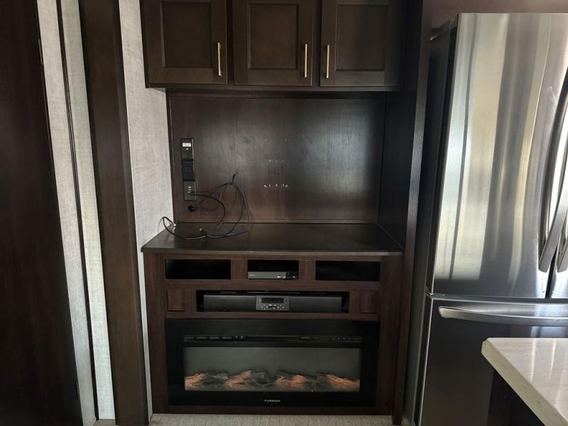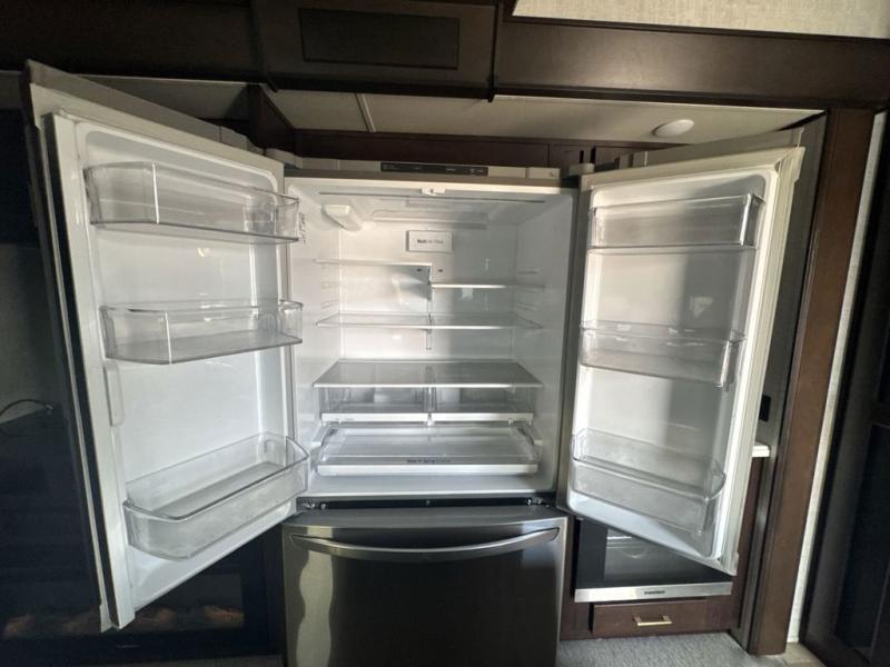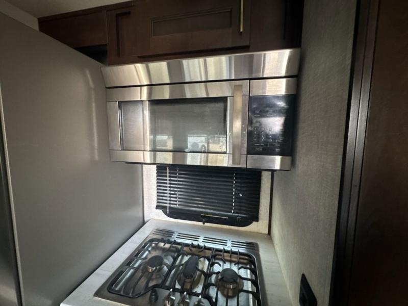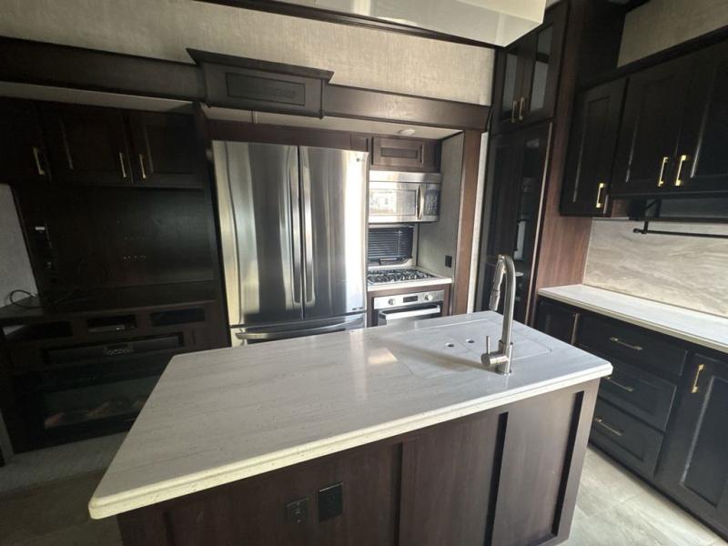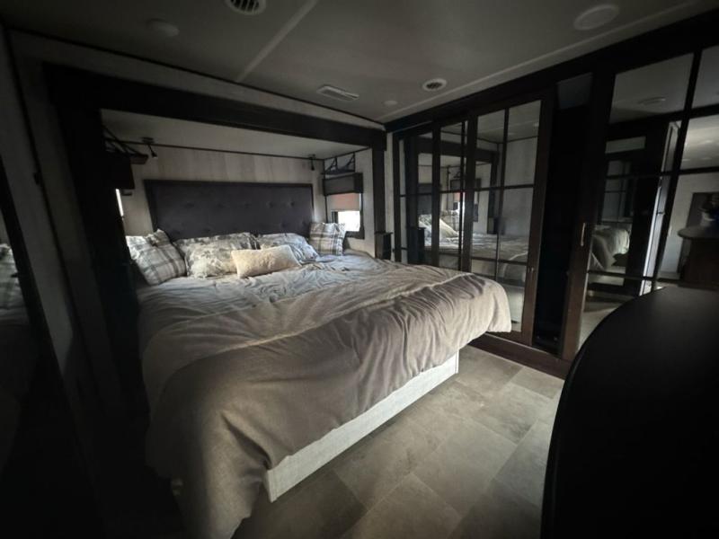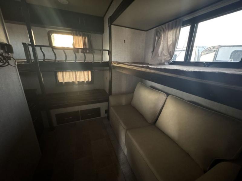 Imagine your family of seven traveling the countryside with your home on wheels behind you where ever you land. Now picture your kids laughing and playing in their own bunkhouse on the bunk beds or the split tri-fold sofa, and you and your spouse are reading a book while laying on the pillowtop mattress on the opposite side of this fifth wheel. The next day you can make breakfast or lunch depending on what time you wake up with all the kitchen amenities provided. You might even choose to cook the sausage outside on the outdoor kitchen. The convenience of having a full bathroom for yourself and a half bath for the kiddos is a "must have" feature. Come see what else you can't travel without on your next vacation.