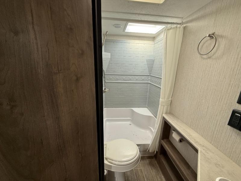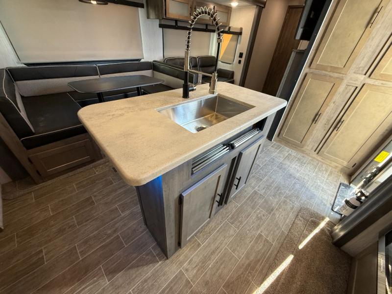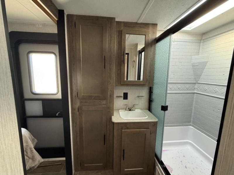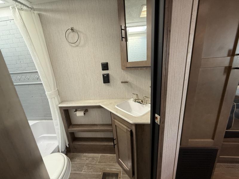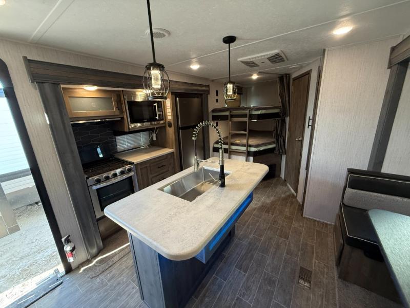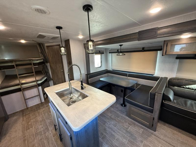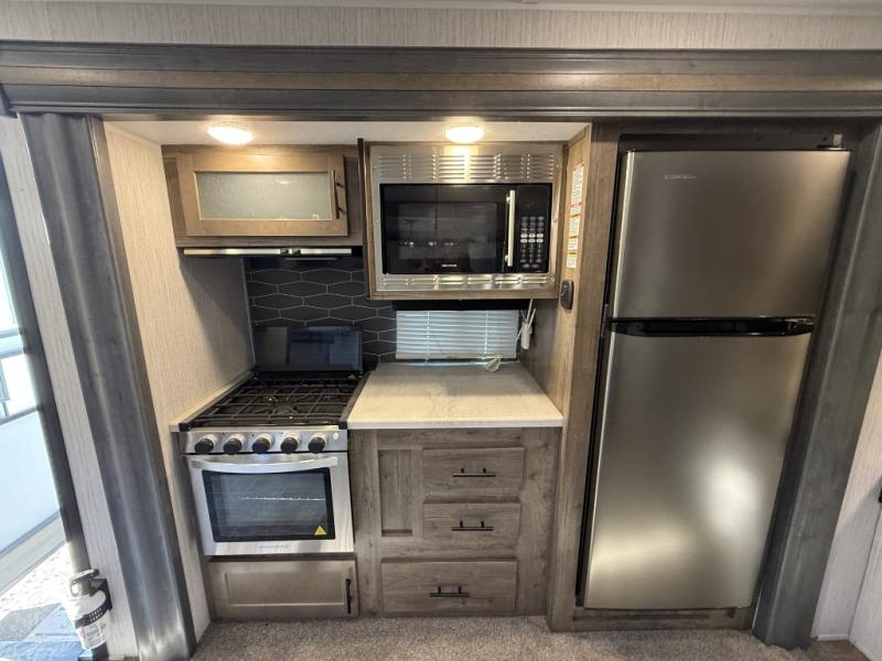 This fantastic Puma travel trailer gives you the ultimate convenience with its two full bathrooms! Plus, you also have extra interior living space because of the opposing slides which will make it easy to work around the kitchen island as you use the high-rise pull-down faucet in the undermount stainless steel sink. You can even switch on the Bluetooth stereo to make washing dishes fun. At the end of the night, take your exhausted body to the front of this trailer where you will find an amazingly comfortable master suite which has both a private entrance into the bathroom and a private exterior entrance.