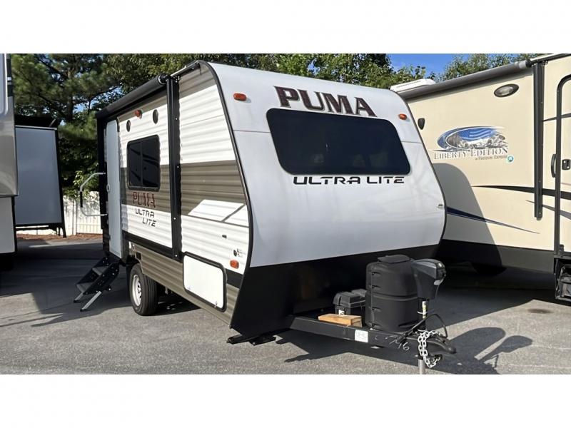 Do you like to get away at a moment's notice? This Puma Ultra Lite travel trailer will give you the ability to do so! Once you pack up your essentials into the overhead cabinets and place your perishables in the 12V residential refrigerator, you'll be ready to hit the road. While you're out and away from home, you won't have to worry about where you will find dinner because the two-burner cooktop will allow you to make healthy meals wherever you are, and the 38" tub in the private bathroom will give you a chance to stay clean while you're away too. You can even bring along a friend or two since there is an RV queen bed and a booth dinette for sleeping.