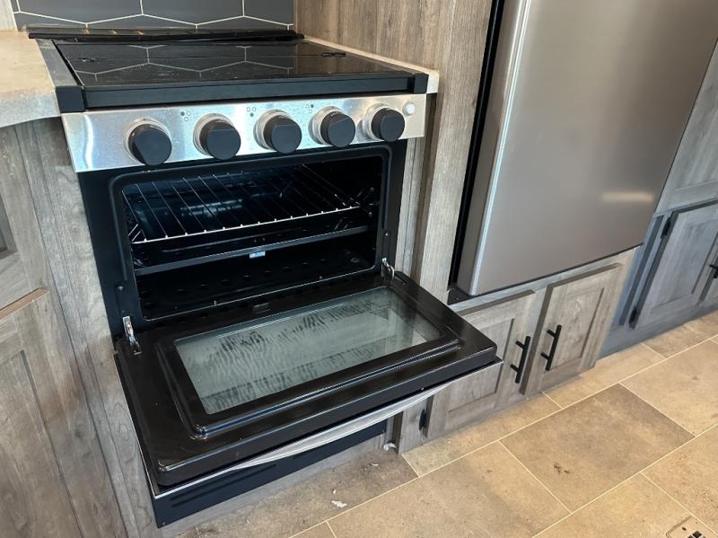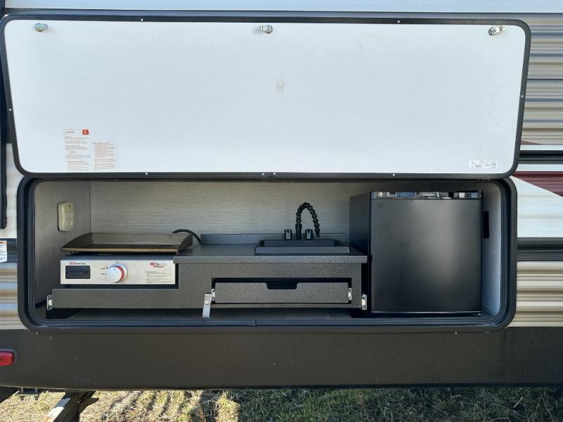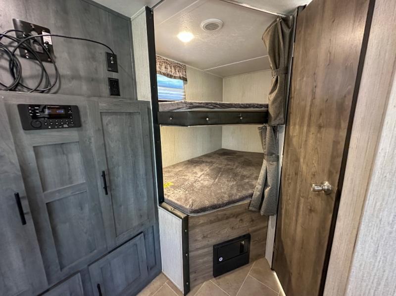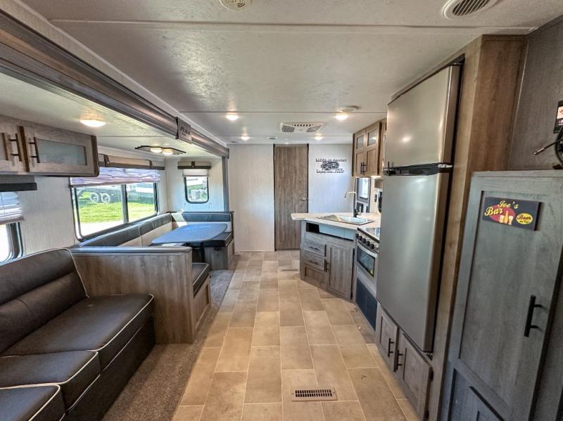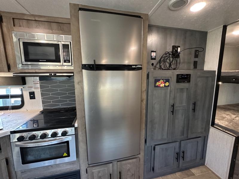 This Puma XLE Lite travel trailer is the perfect option for those who enjoy camping with the entire family. Because this unit includes an RV queen bed in the front private bedroom and a set of double-size bunks, it can sleep ten people anytime you take it on the road. The fully stocked kitchen comes with a large pantry, three-burner stove top, and a residential refrigerator which makes it a breeze to cook up a hot meal for you and your traveling companions.