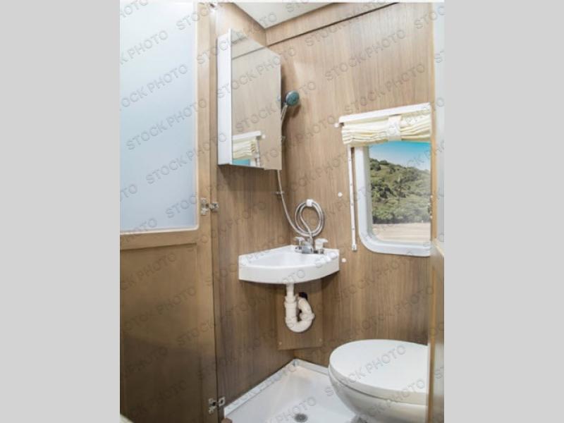 This motorhome features two dining locations for you to enjoy your delicious meals at thanks to the innovative Lagun table. There is also an array of storage options between the two-pantry style cabinets and the soft-close drawers. If you have to get a little bit of work done while on the road then you will love the front lounge workstation with the 120V power outlet, the USB charging ports, and the extended Corian countertop with a privacy shade and storage cabinets too. The convection microwave makes it easy for you to pop a bag of popcorn in and enjoy eating it while you relax on the power sofa with memory foam sofa cushions!
