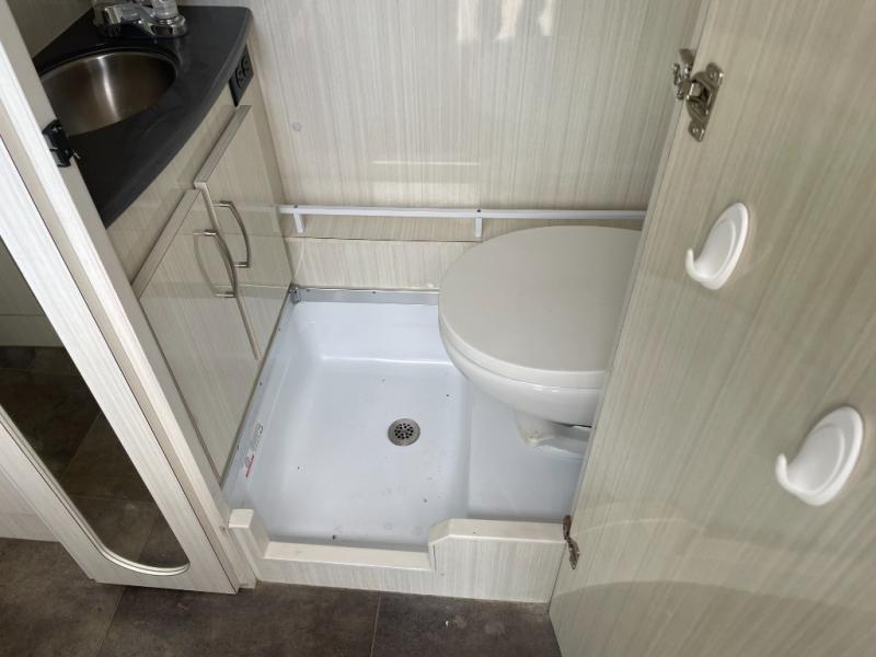 You will experience a comfortable ride in this motorhome with memory foam sofa cushions. The wet bath comes fully equipped with a medicine cabinet with a mirror, a Corian countertop, a storage compartment, and a towel rack, plus an upgraded handheld showerhead. The exterior shower also has a handheld showerhead to make rinsing off the mud even easier. All of the seating throughout is covered in Ultraleather, including the swiveling captain's chairs. With the generous amount of available storage in the full size wardrobe, you can easily reach any of your hang up clothes!