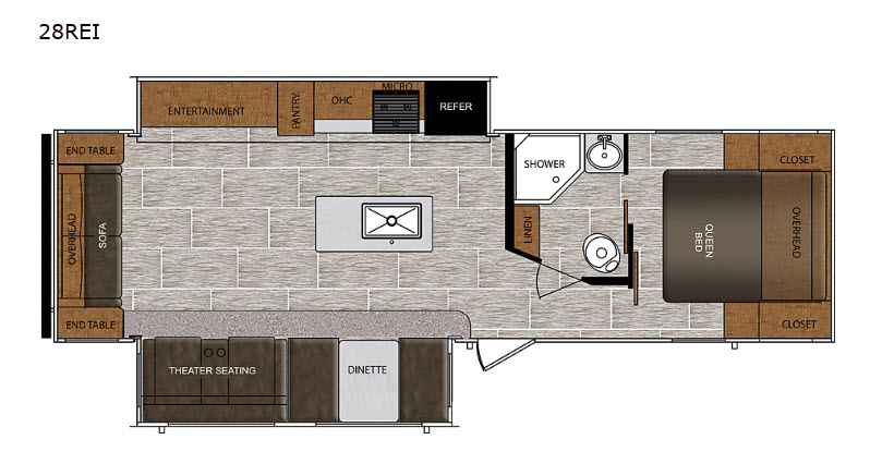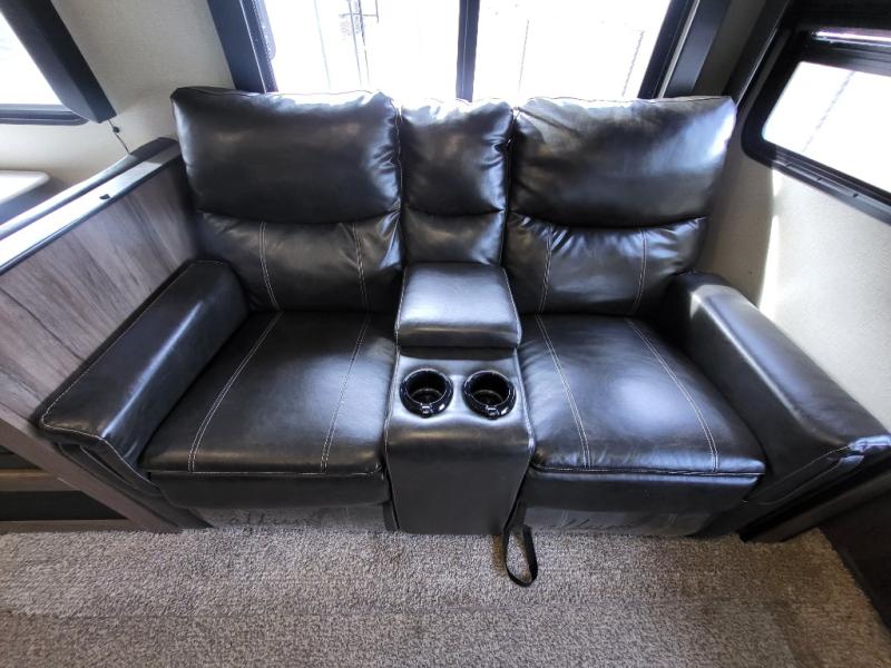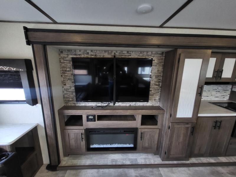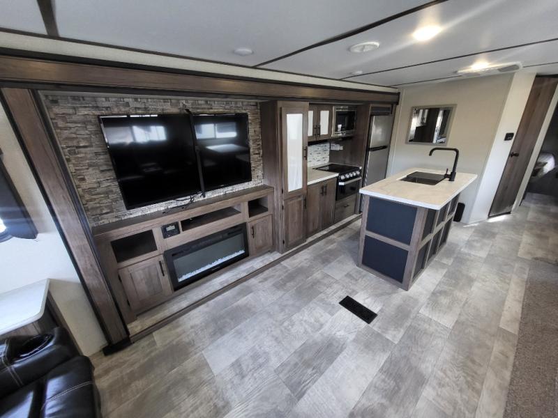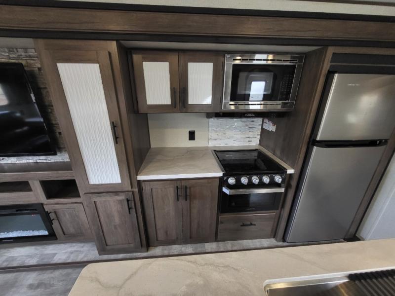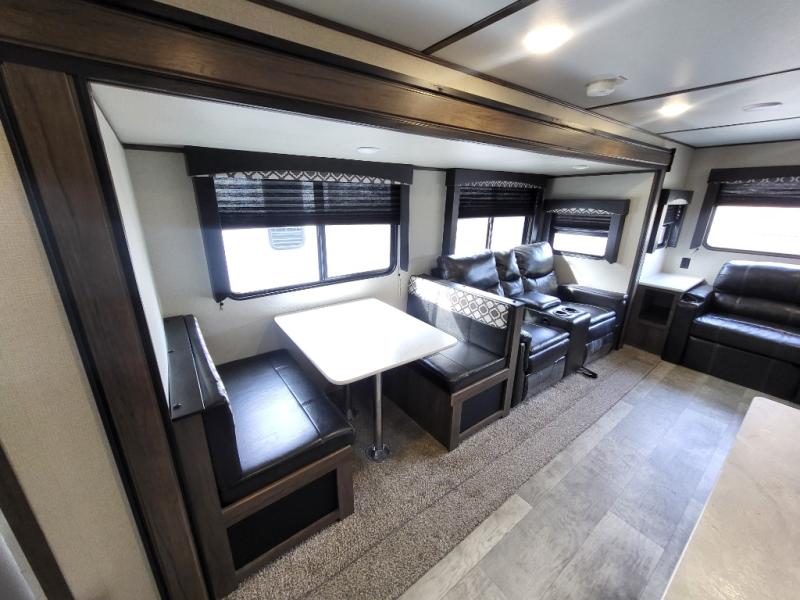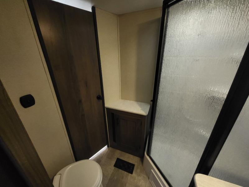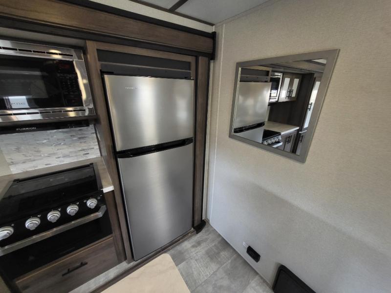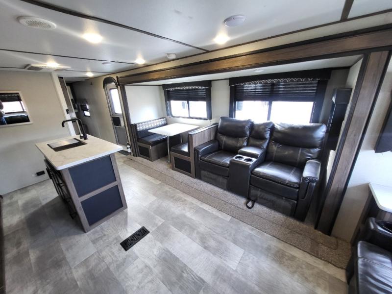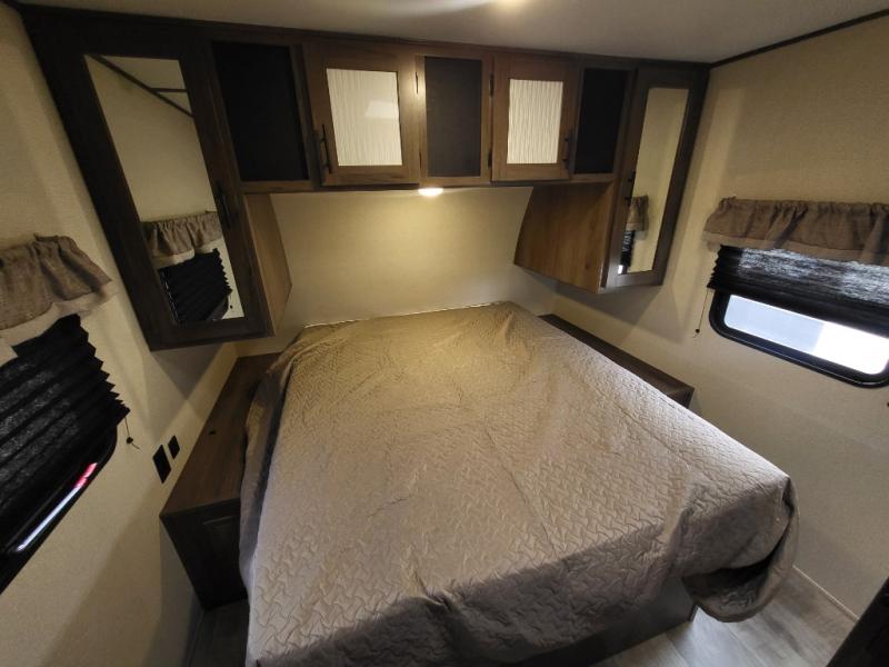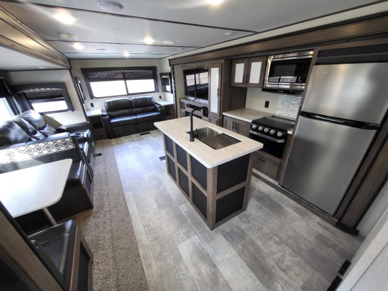 Travel comfortably and stylishly every time with this Avenger ATI travel trailer! As you spend each night sleeping on the queen-size bed in the private master suite, you will appreciate the convenience of being able to discreetly enter the neo-angled shower in the full bathroom without waking up your guests who are sleeping on the sofa or booth dinette. Because there have been two opposing slides included in the central living area, there is plenty of space to prep dinner or wash dishes on the kitchen island.