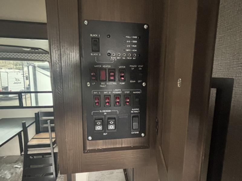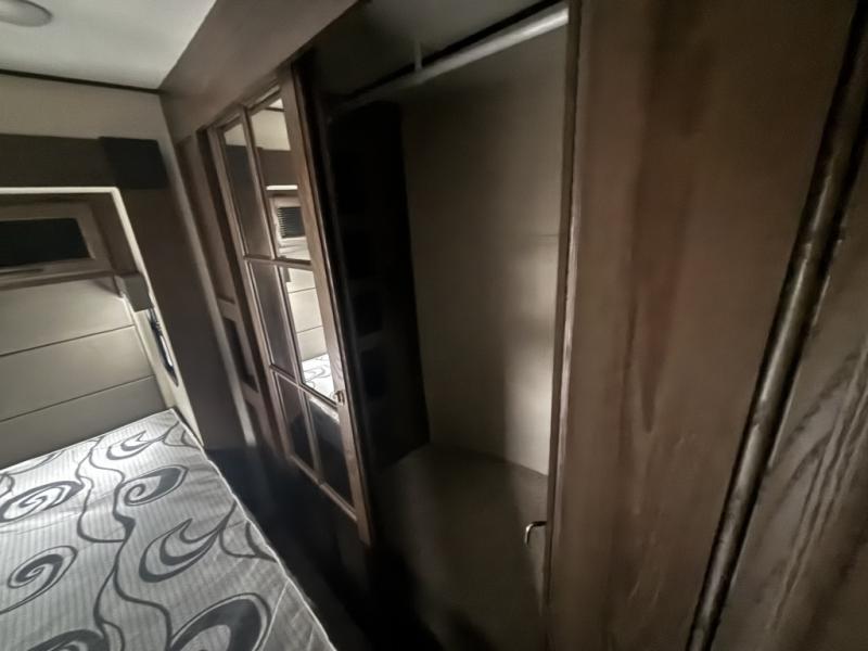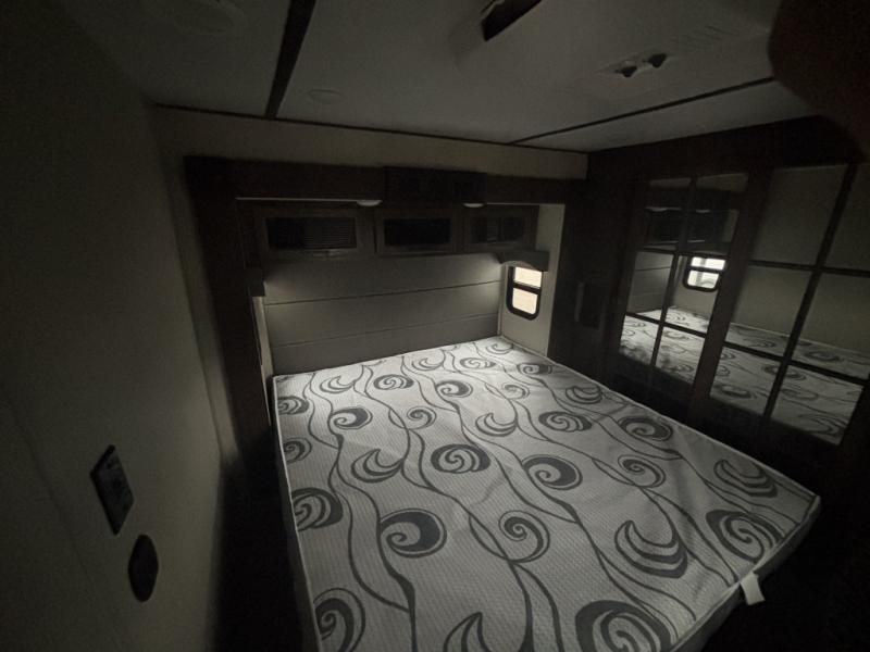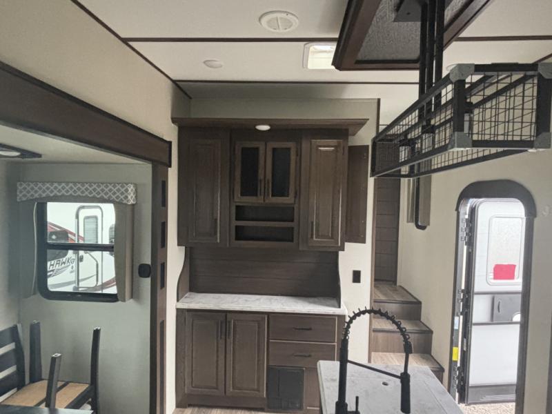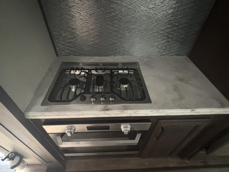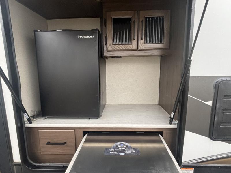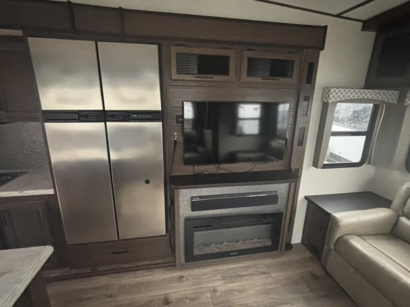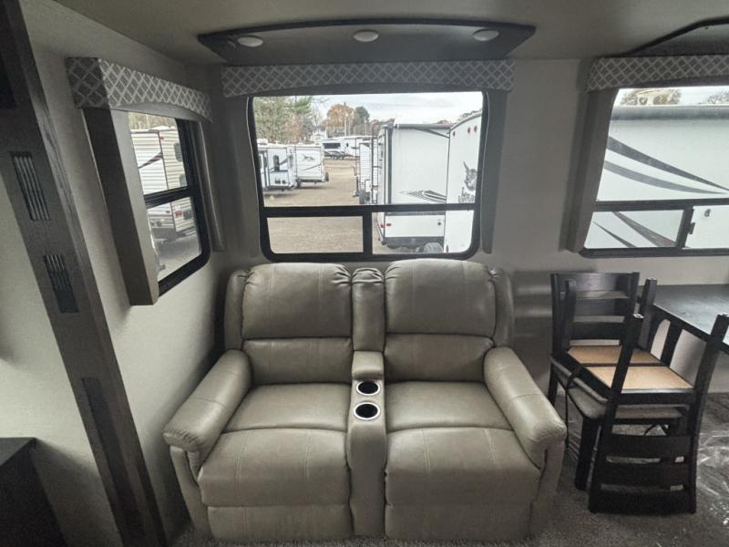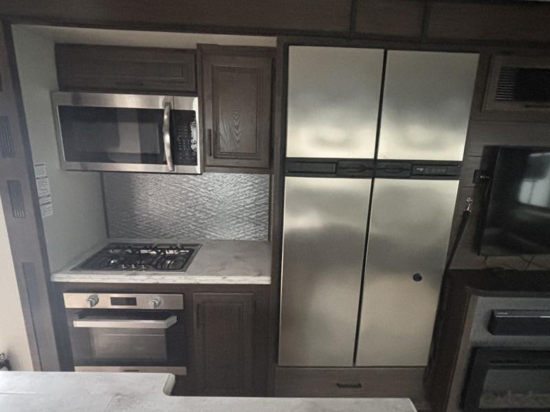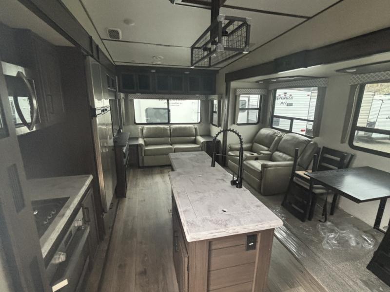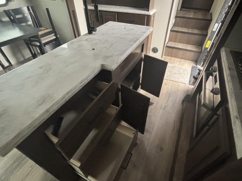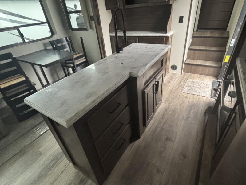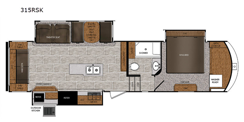 This fifth wheel has all the amenities to make your family feel right at home while you camp. The front private bedroom includes a king bed, a dresser, and a large wardrobe, plus there is a space for an optional washer. You'll love the rear living area with a sofa and theater seats for a relaxing evening. This unit features three slides, which provide extra space. The chef will love the kitchen island with double sinks, and you will love having your own space to cook with the outdoor kitchen. Enjoy dinner at the booth dinette that comes standard in this fifth wheel, and for an even more at-home feel, choose the free standing dinette option. This model has everything you've been looking for, plus more!