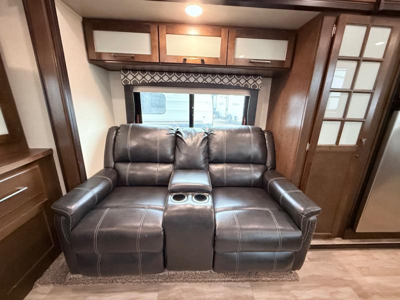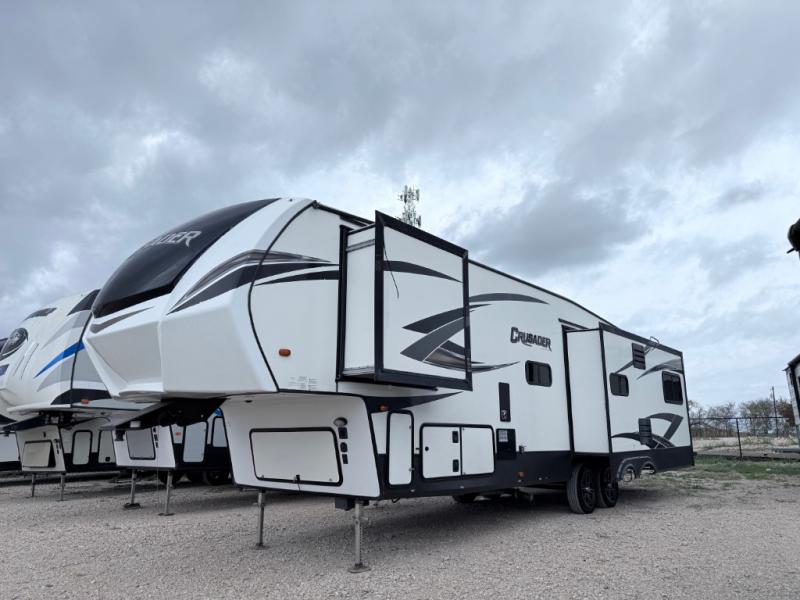 Come step inside this spacious fifth wheel that has all the amenities your family is sure to love. With a private front bedroom, mom and dad will feel as comfortable as they do at home. The kids or grandparents will find sleeping space on the hide-a-bed sofa. Enjoy the rear entertainment area in this model that includes two theater seats! Cook up a meal in the large kitchen with ample counter space, a double sink for easy clean-up, a pantry, and a hi-top dinette with a booth the kids will love to sit at. You'll appreciate the bathroom in this unit that features a large sink and a medicine cabinet with a mirror to get ready for the day. Come see why this Crusader fifth wheel is perfect for your camping adventures!
