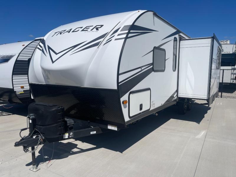 Who says you can't go camping while still enjoying the comforts of home?! This Tracer travel trailer allows you to do just that with its theater seating, front master suite, and plenty of storage for all your gear. Freshen up each morning in the dual-entry bath before heading to the rear kitchen to prepare breakfast, and you can dine at the booth dinette afterwards. This model also include two entry doors with one door leading into the rear kitchen and the other door leading into the master bedroom. Now that's what I call convenience!
