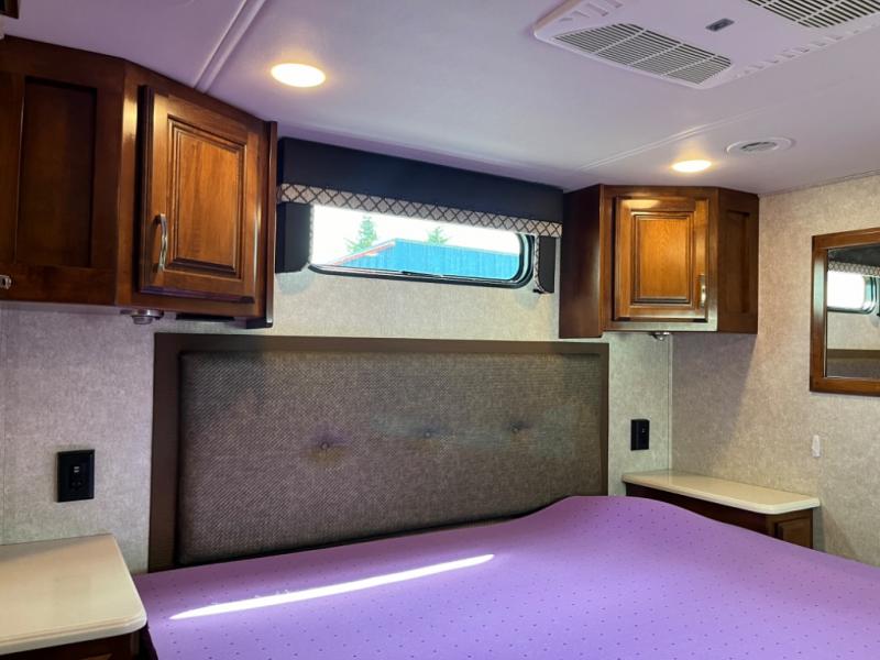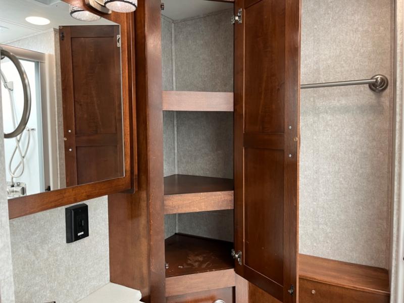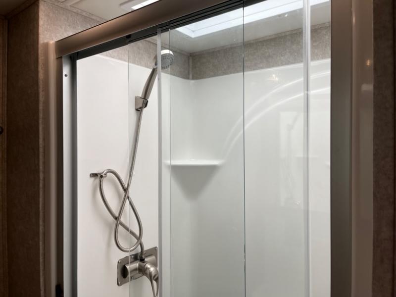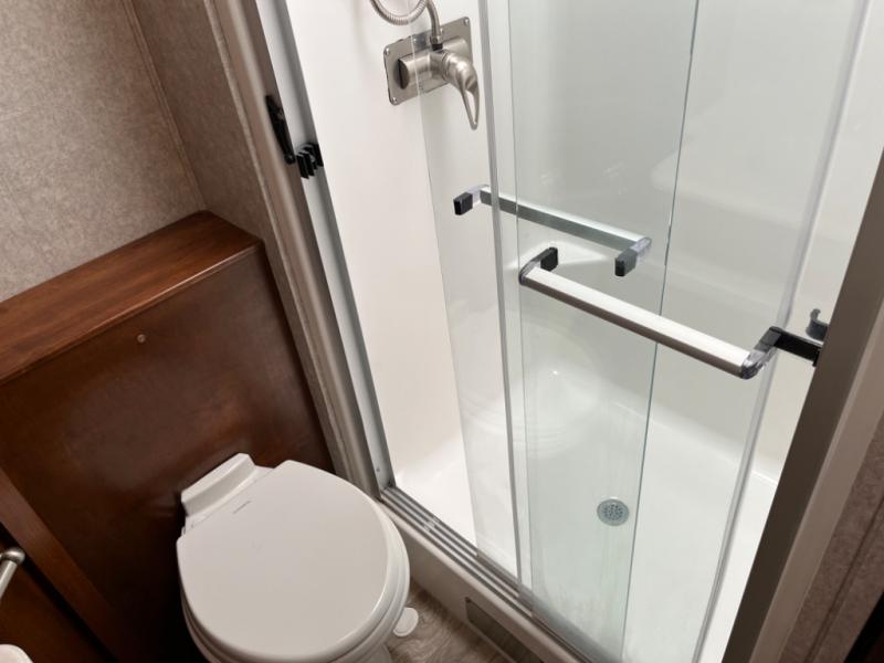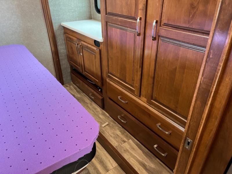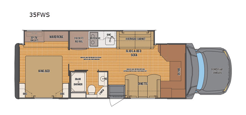 This motorhome features a private bedroom for you and plenty of sleeping space for the kids, including a cab-over Slide n' Stow bunk with a privacy curtain. Prepare breakfast every morning on the two burner cooktop or use the handy convection microwave and the 18 cu.ft. residential refrigerator can store food for the whole week. This model includes a slide-a-bed sofa and a dinette that is great for meal times, game night, and additional sleeping space as well and the full bath will be a big plus when you are away from home. When it's time to call it a night, mom and dad will love the rear private bedroom with a king bed, a wardrobe for their things, and a 32" TV on lift for a late-night movie!