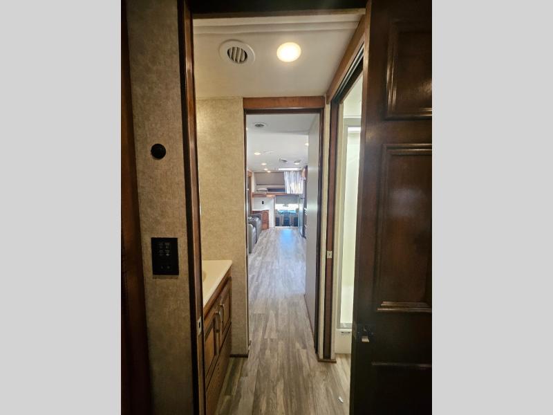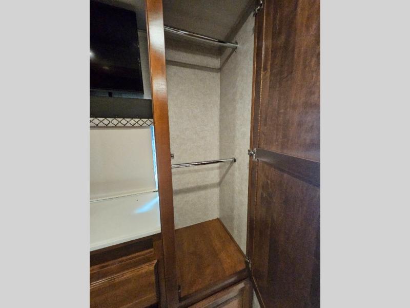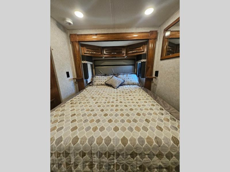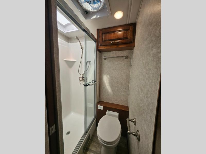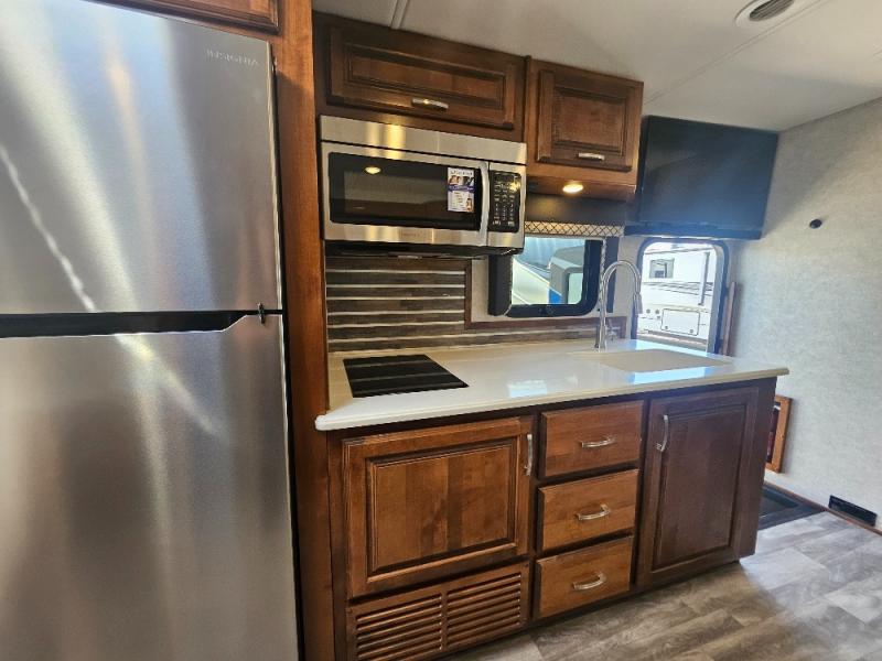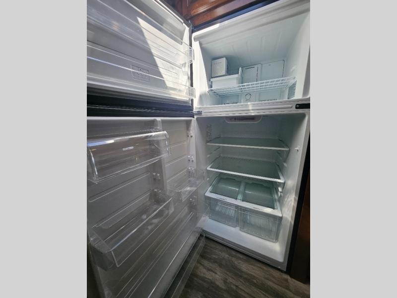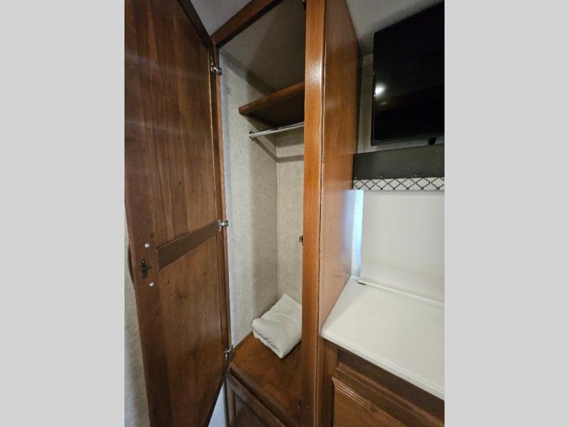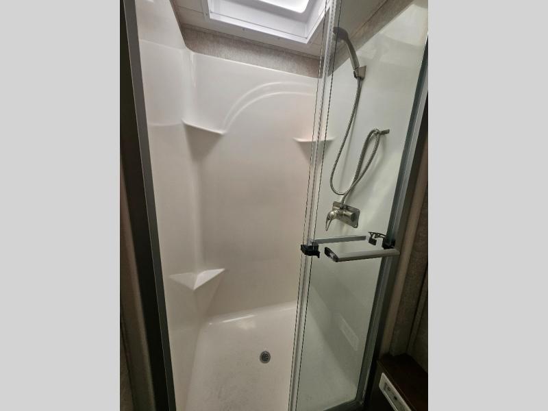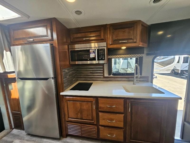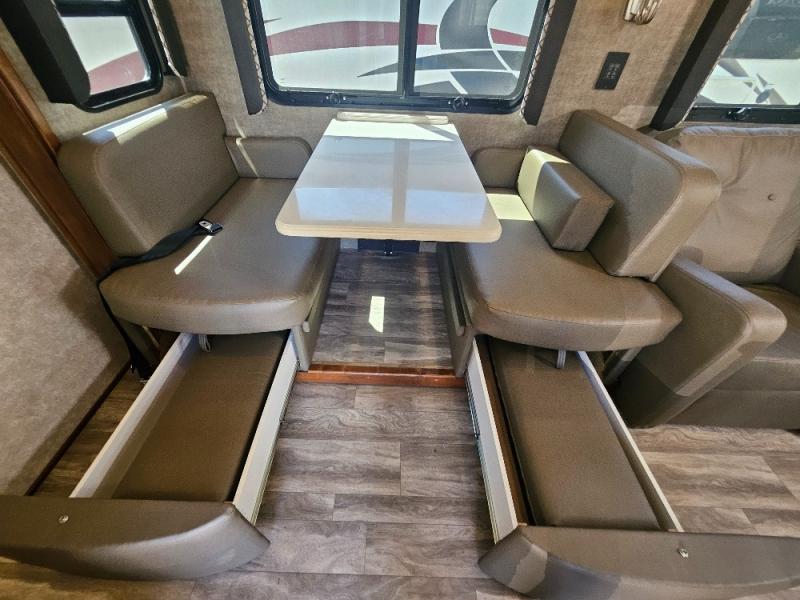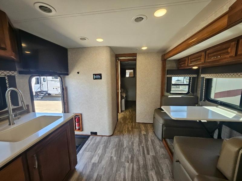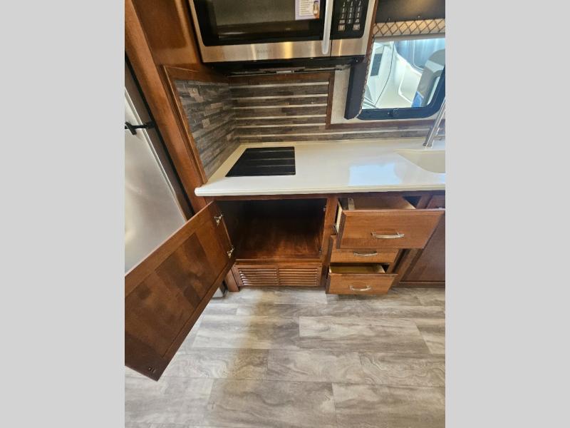 Travel, sleep, eat, and relax all in this motorhome that includes a large slide out in the living area and a second slide out in the rear bedroom. The kids will love to watch a movie on the 39" TV and they can sit on the booth dinette or the slide-a-bed sofa. Prepare a quick lunch on the two burner induction cooktop or use the convection microwave, then head outside to find a trail. The split bath allows someone to clean up while someone else brushes their teeth before bed. Mom and dad will appreciate their own private bedroom with two closets and a 32" TV.