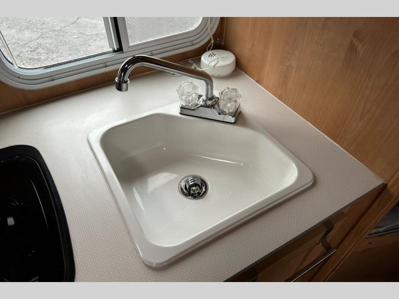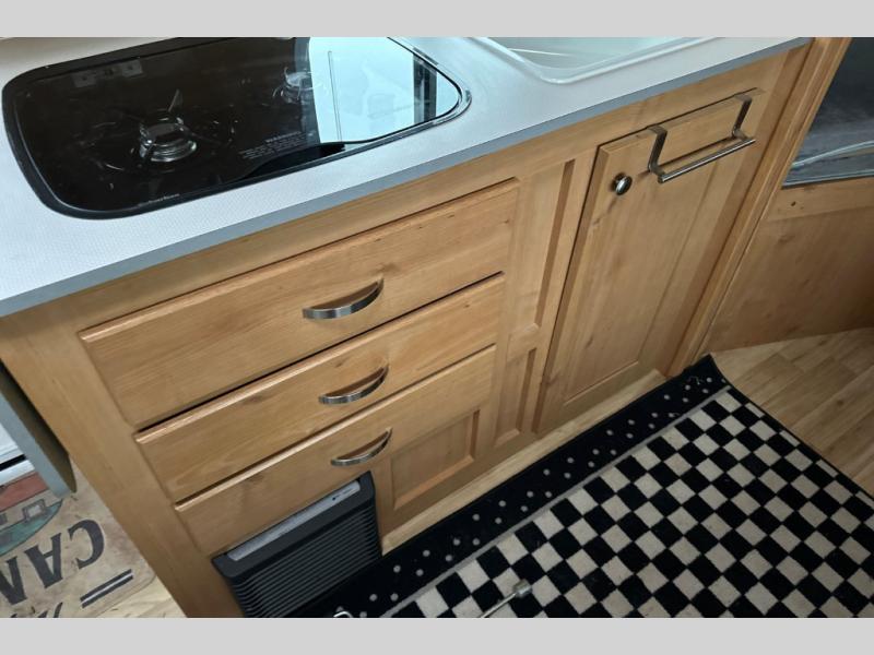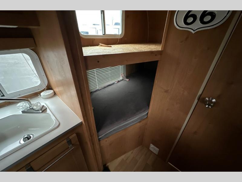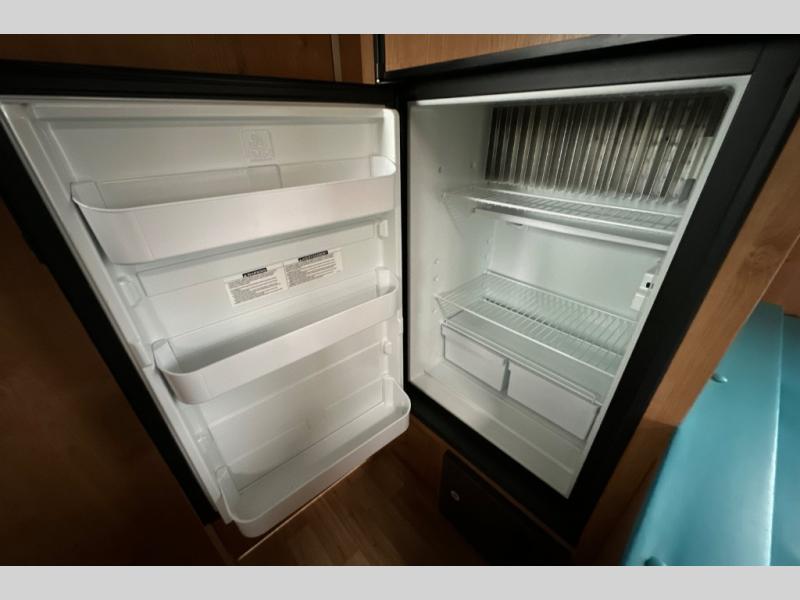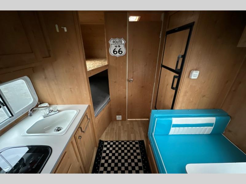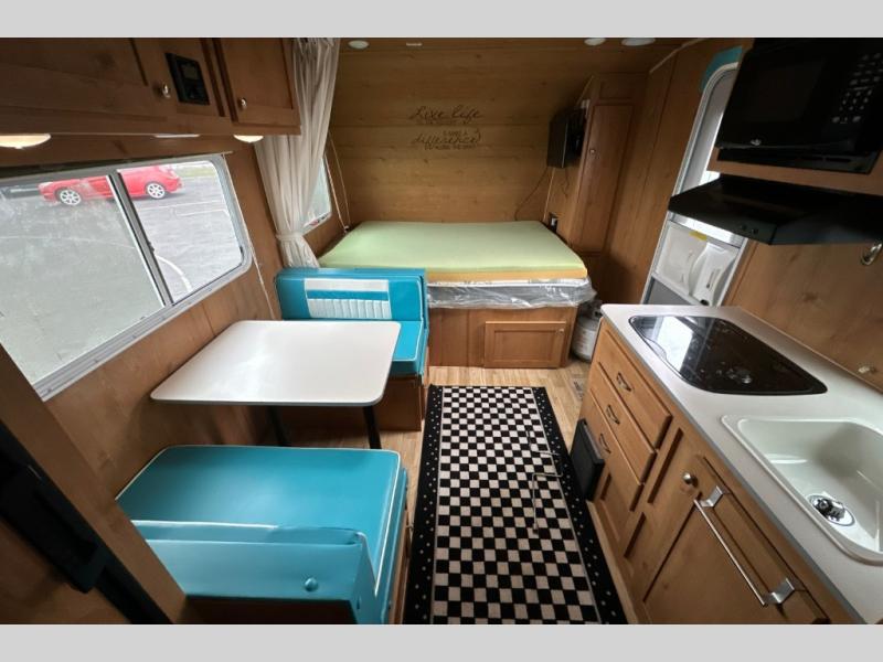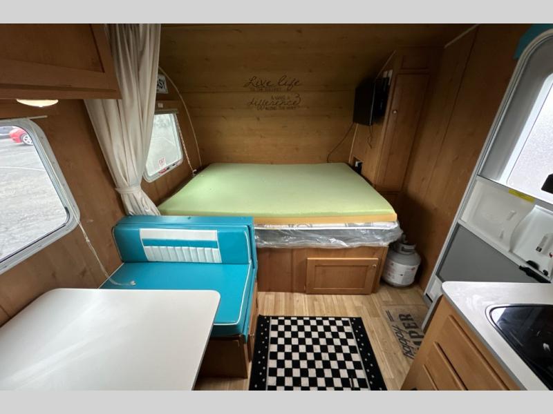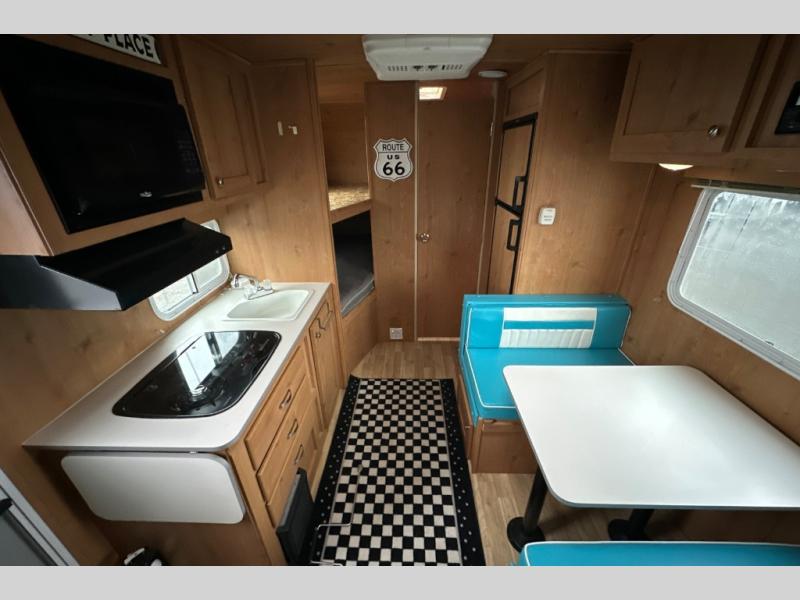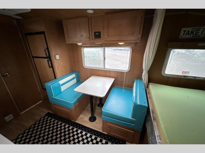 Let the family tag along on your next outdoor excursion with this Retro travel trailer! This trailer's ability to sleep five people is what makes it helpful for families who like to get outdoors and explore. You will appreciate having a booth dinette so that you can eat dinner or play games, and the RV queen bed will be a relaxing place to unwind after a long day of fun. You will also have a closet by the bed so that you can keep your clothing easily accessible.