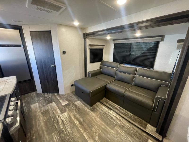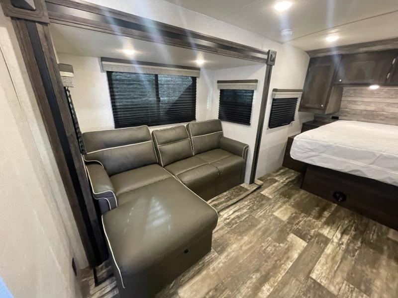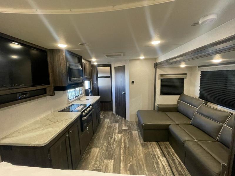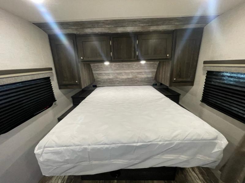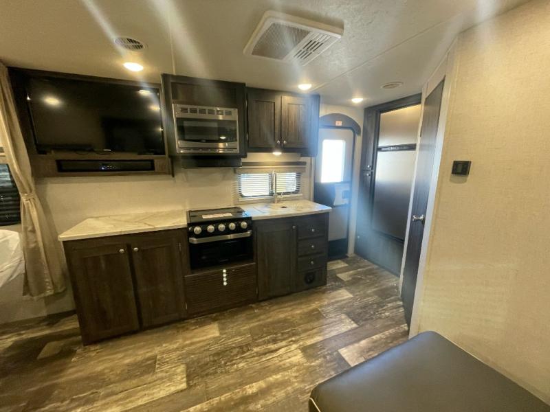 Eat, sleep, and relax all in this travel trailer that features a single slide out for more interior space and a rear corner bath for added privacy. Prepare breakfast each morning on the three range cooktop or use the handy microwave oven, and the L-shaped sofa with a dinette table will be the perfect place to enjoy your coffee at. Mom and dad will appreciate the queen bed in the front semi-private bedroom and shirt closets on both sides of the bed for their things.