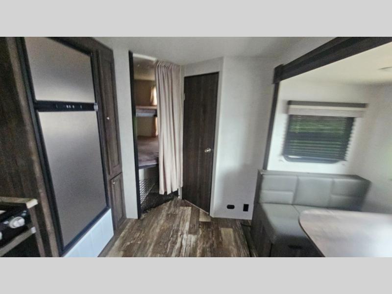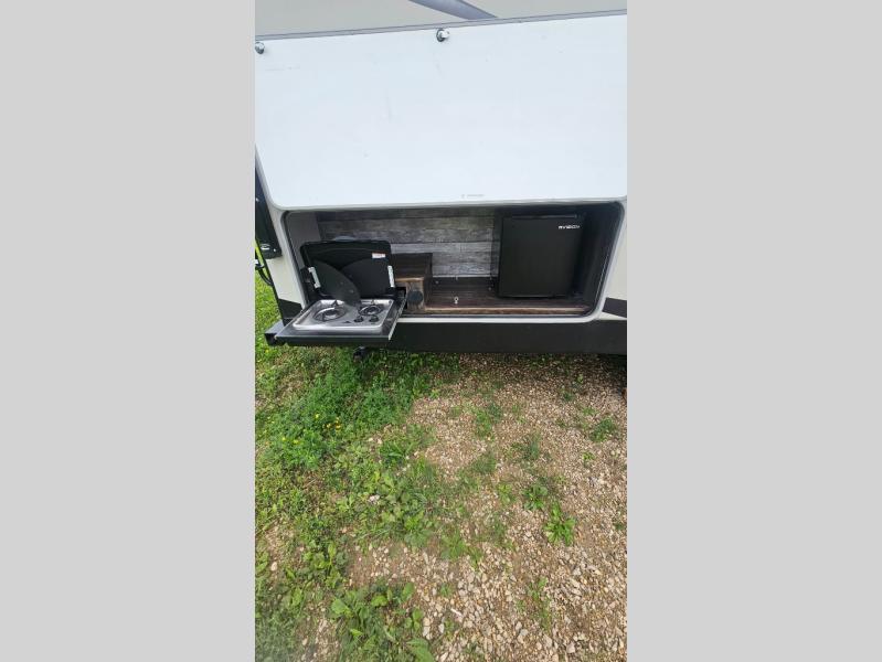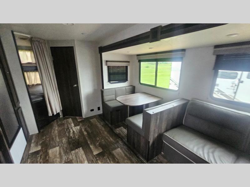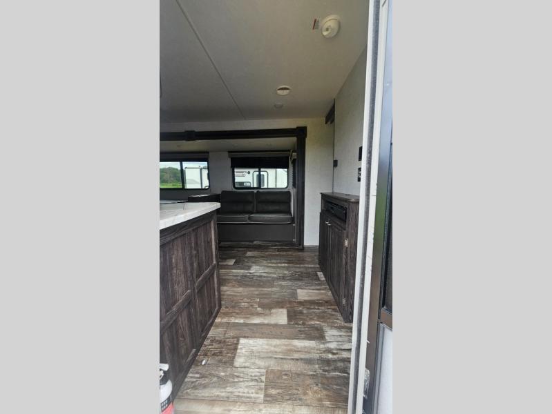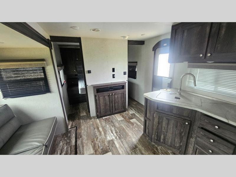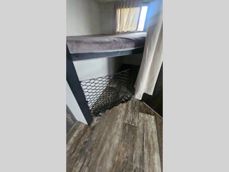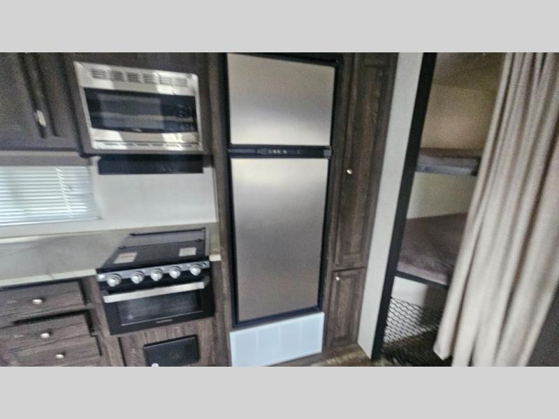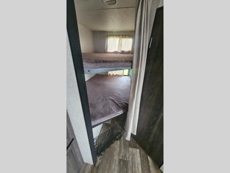 When the great outdoors calls your name, load up the kids and head to your favorite state park in this travel trailer. The large slide out in the living/kitchen area allows you to stretch out and the kids will have space to play a game on the floor. This unit features full kitchen amenities inside as well as an outdoor kitchen for when the weather is nice. The kids will love climbing into the double bunk beds each night and the front private bedroom with a queen bed will remind you of home. This travel trailer also includes a booth dinette and a sofa that can convert to comfortable sleeping space for additional guests.