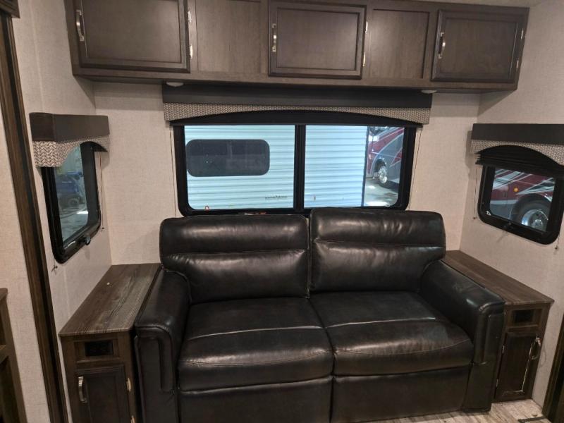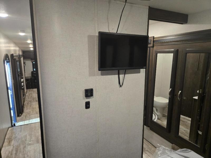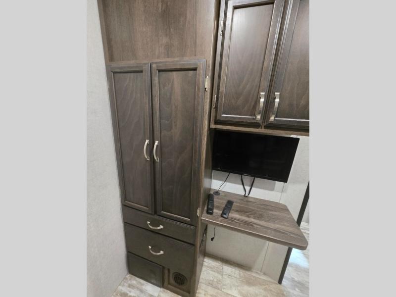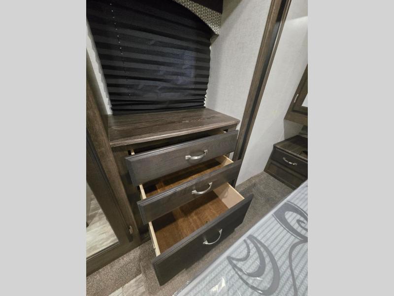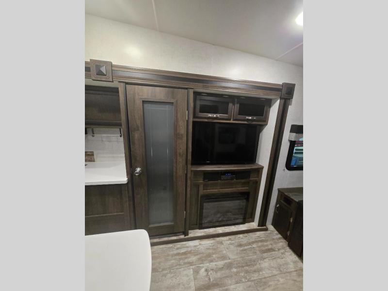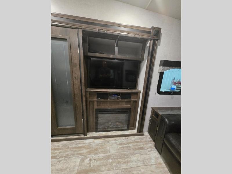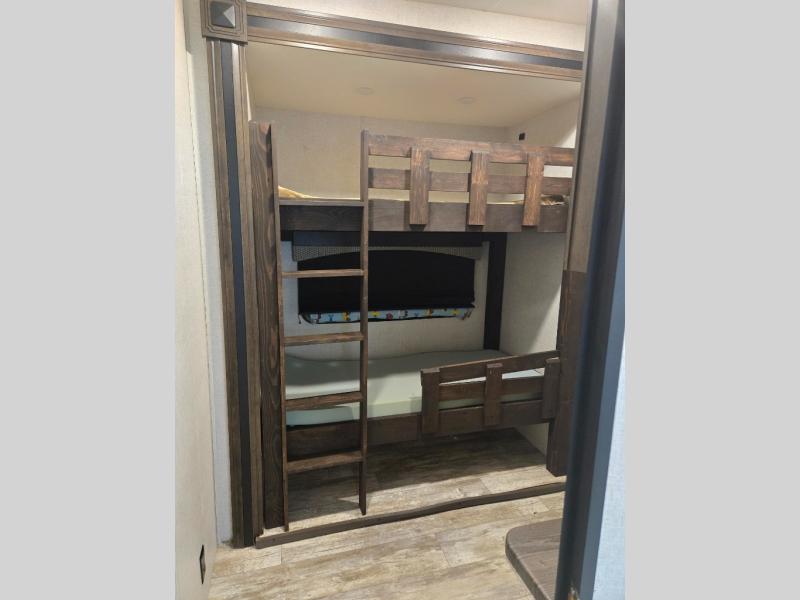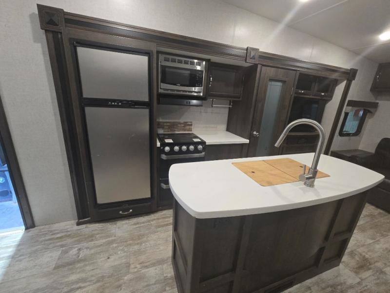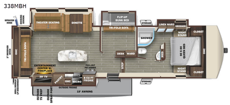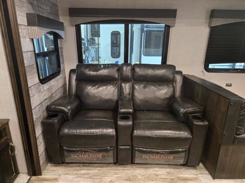 The middle bunkhouse can be utilized as a bedroom at night, and an office or second living area during the day when you have a desk, a wardrobe, a tri-fold sofa with flip-up bunk bed all in the same space. You will love the kitchen layout with two slide outs opening up the area around the kitchen island. The stainless steel appliances offer everything you will need to make a holiday meal including pull-out pet dishes for your best friend. The fireplace and 39" LED TV are in sight, and your family can gather together to visit on the tri-fold sofa and the heated theater seats with massage setting. The master bedroom offers electric outlets and USB ports, a second entry into the bathroom and plenty of storage. Outside you will surely appreciate the protection provided by the 19' power awning with LED lighting and integrated speakers, and the outside fridge allows you to take a few more drinks.