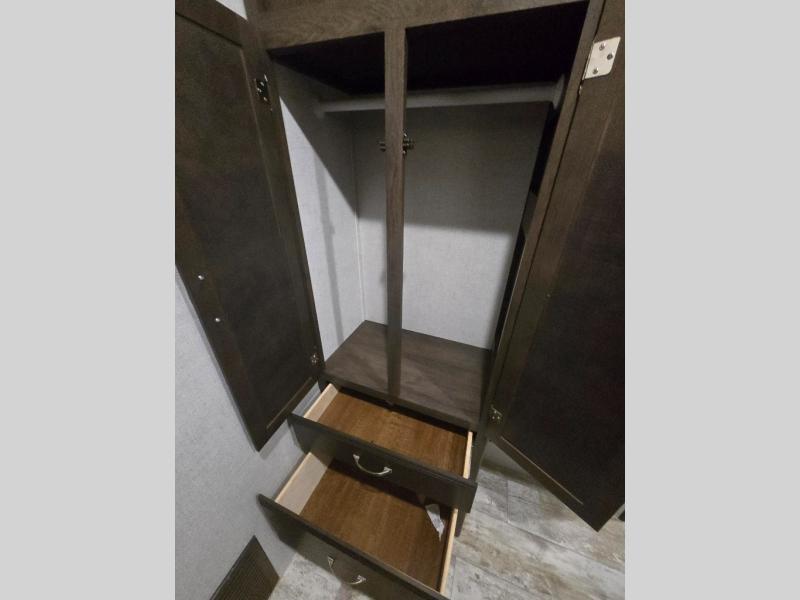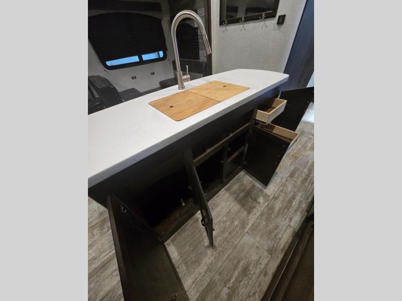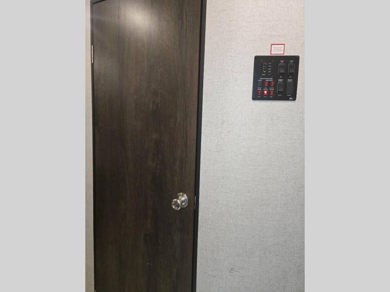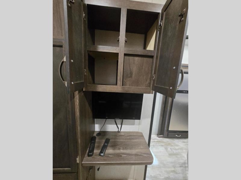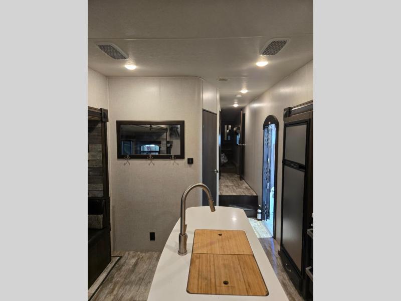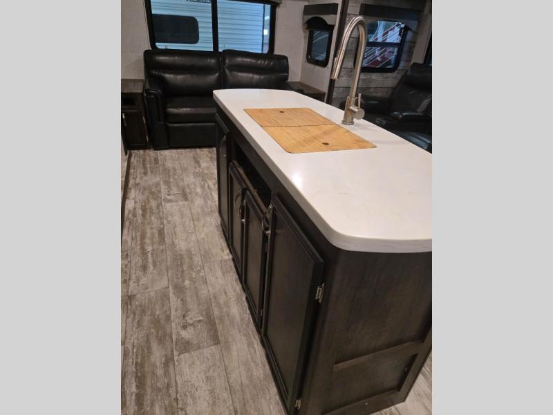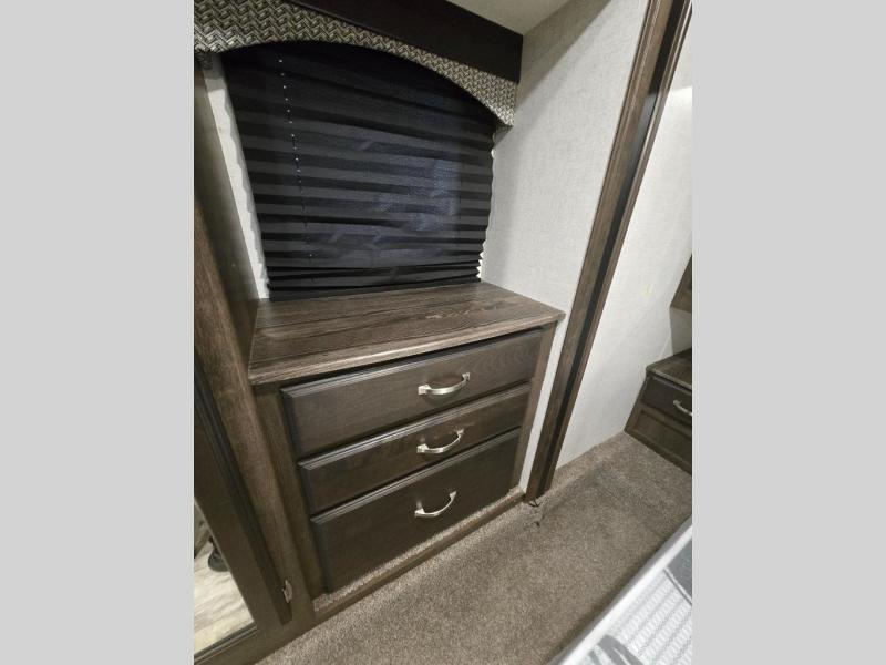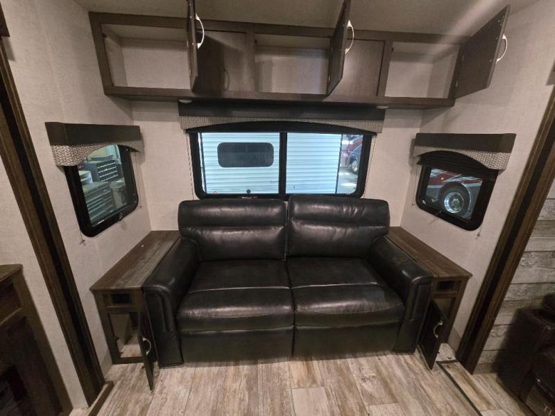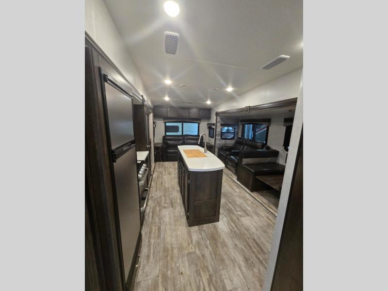 The middle bunkhouse can be utilized as a bedroom at night, and an office or second living area during the day when you have a desk, a wardrobe, a tri-fold sofa with flip-up bunk bed all in the same space. You will love the kitchen layout with two slide outs opening up the area around the kitchen island. The stainless steel appliances offer everything you will need to make a holiday meal including pull-out pet dishes for your best friend. The fireplace and 39" LED TV are in sight, and your family can gather together to visit on the tri-fold sofa and the heated theater seats with massage setting. The master bedroom offers electric outlets and USB ports, a second entry into the bathroom and plenty of storage. Outside you will surely appreciate the protection provided by the 19' power awning with LED lighting and integrated speakers, and the outside fridge allows you to take a few more drinks.