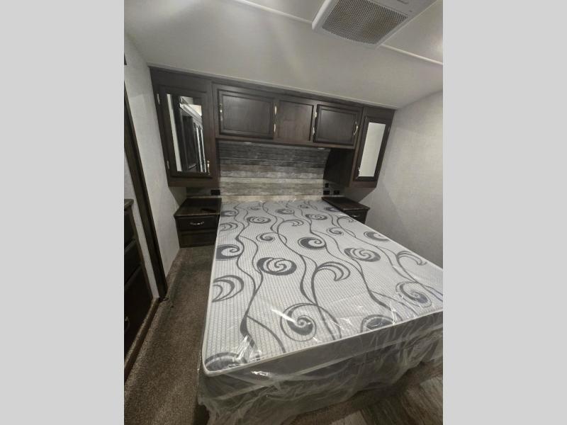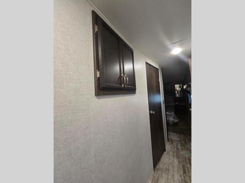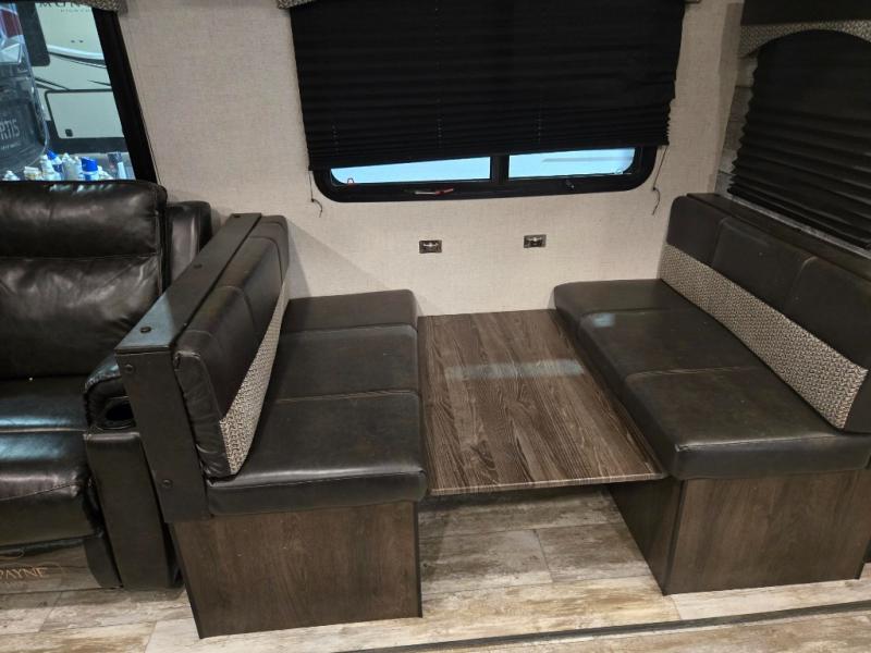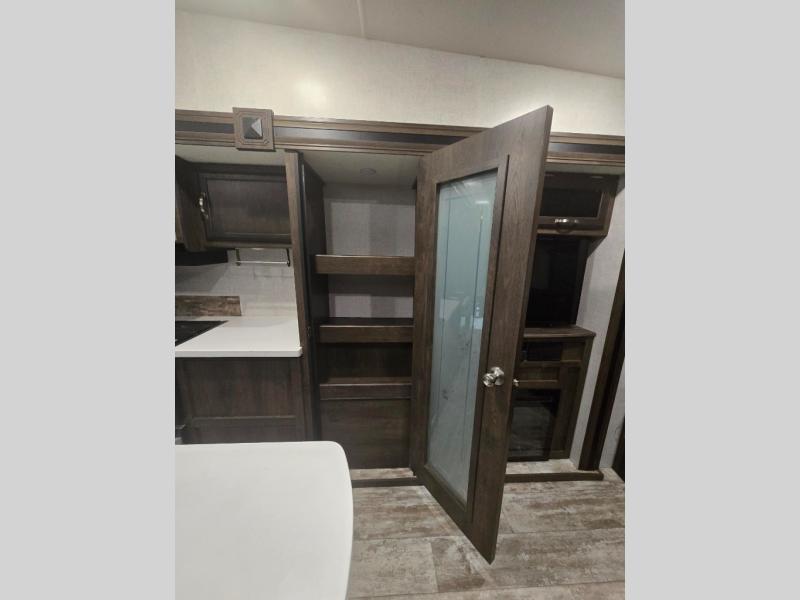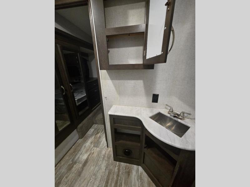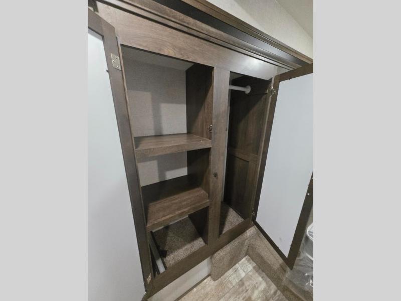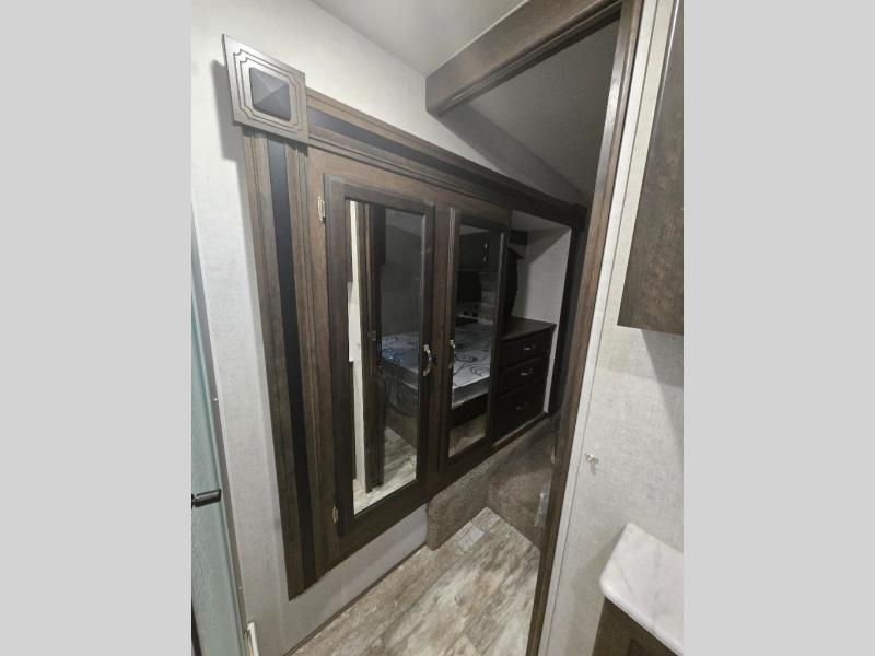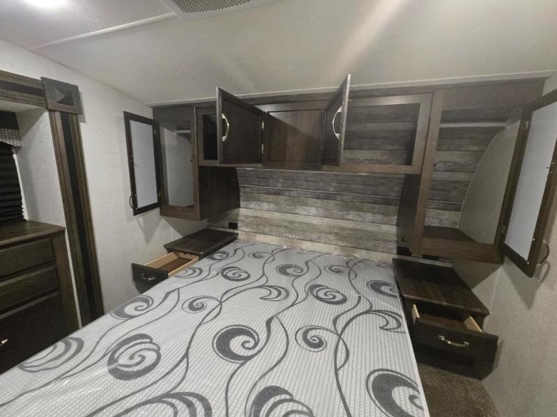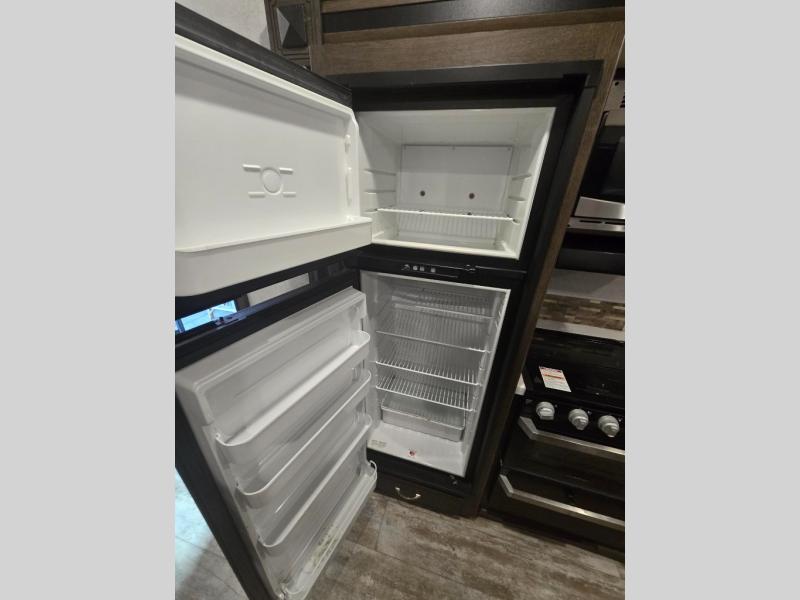 The middle bunkhouse can be utilized as a bedroom at night, and an office or second living area during the day when you have a desk, a wardrobe, a tri-fold sofa with flip-up bunk bed all in the same space. You will love the kitchen layout with two slide outs opening up the area around the kitchen island. The stainless steel appliances offer everything you will need to make a holiday meal including pull-out pet dishes for your best friend. The fireplace and 39" LED TV are in sight, and your family can gather together to visit on the tri-fold sofa and the heated theater seats with massage setting. The master bedroom offers electric outlets and USB ports, a second entry into the bathroom and plenty of storage. Outside you will surely appreciate the protection provided by the 19' power awning with LED lighting and integrated speakers, and the outside fridge allows you to take a few more drinks.