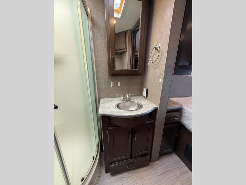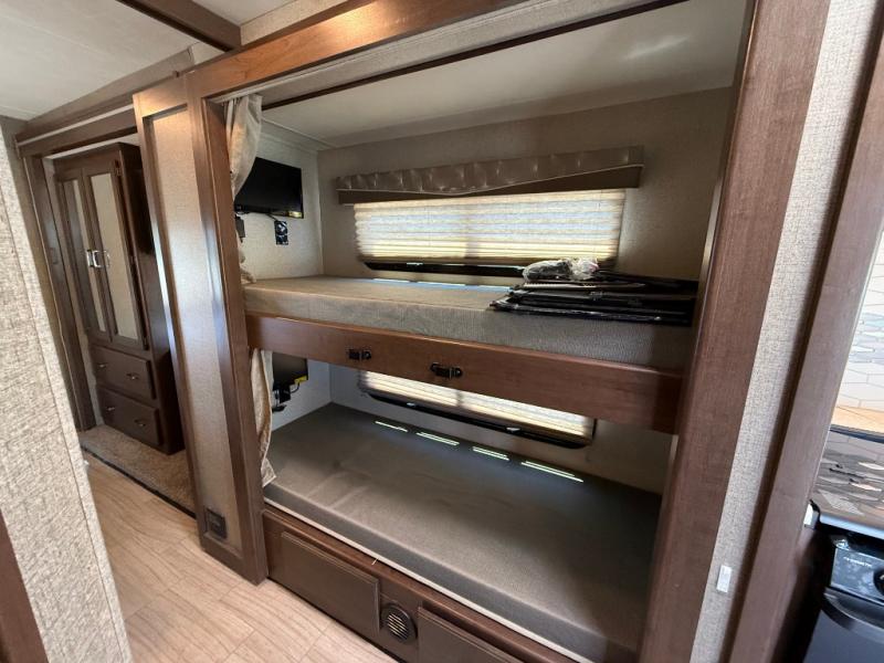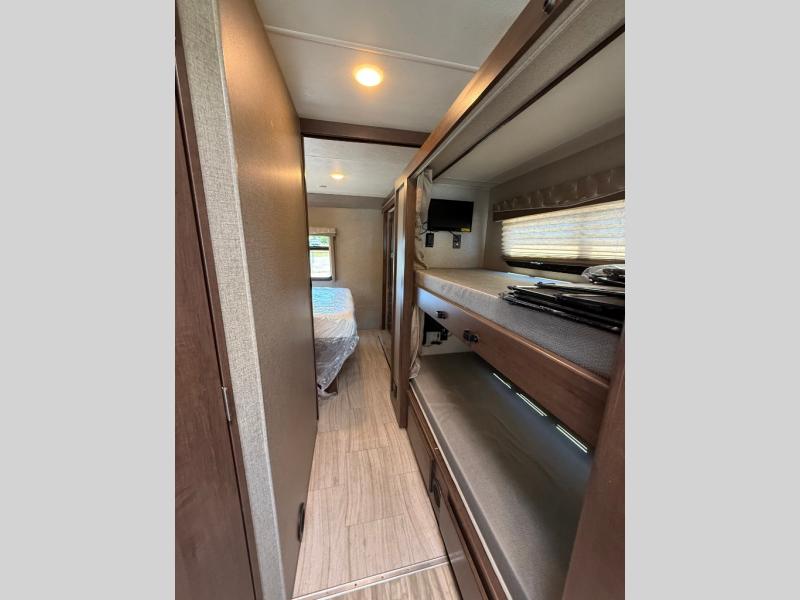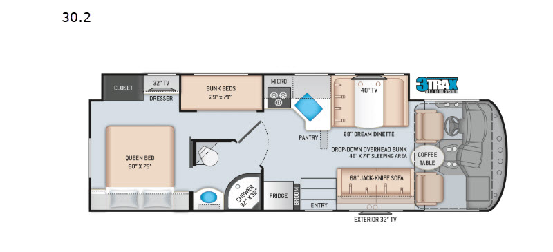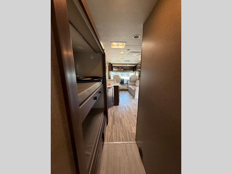 This A.C.E. Class A gas motorhome allows you to visit with everyone after turning your captain's chairs around to face the Dream dinette and jackknife sofa. You can plan your next adventure while eating a meal you cooked in the kitchen or while playing a game. Now picture yourself sleeping on a queen-size bed in your own private master suite while the kids are still sleeping on the bunk beds. You don't even have to use the furniture or drop-down overhead bunk unless you have more overnight guests. Your spouse can sneak through the dual-entry bath without waking up the kids to get to the main area to make breakfast. You can also do some work at the dash workstation or read a book while placing your drink on the coffee table. The full-wall slide on the 3TRAX wall slide system provides plenty of room to move about the coach.