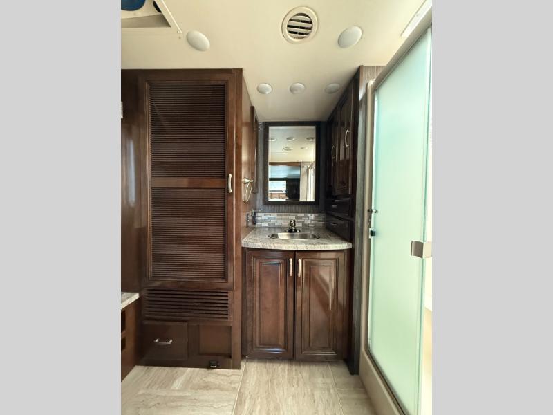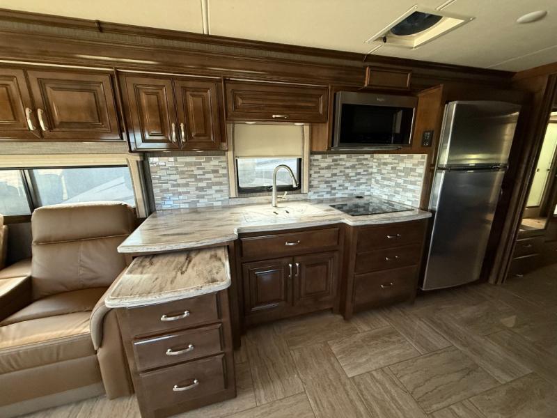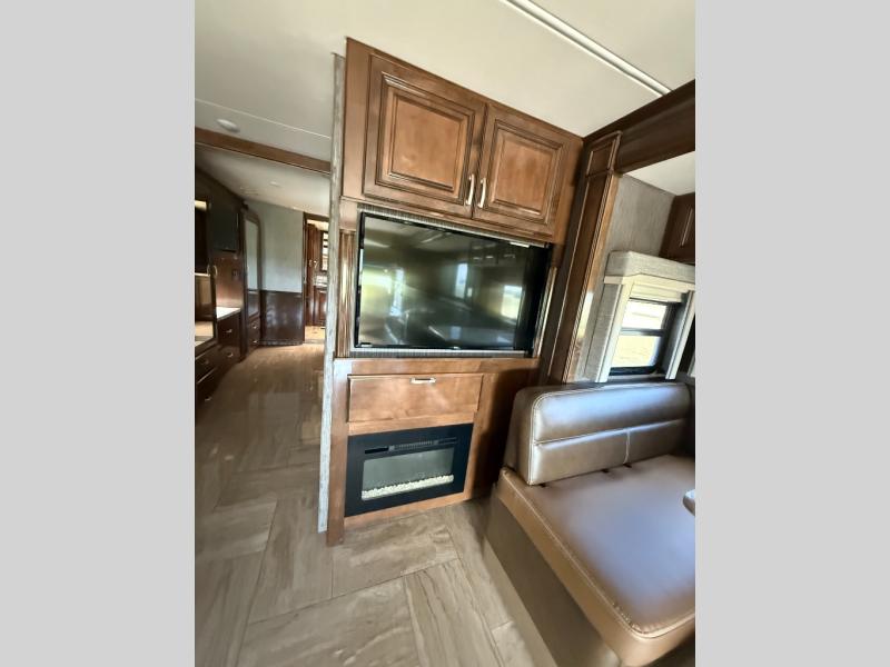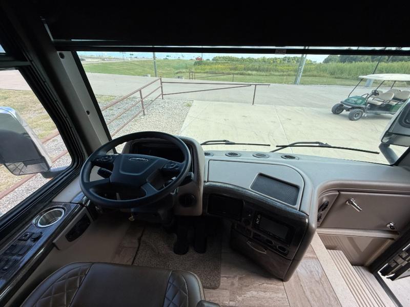 This Aria Class A diesel motorhome will even have you excited to spend the day traveling because of its great interior features that make the road more comfortable! With the electric footrest on the passenger captain's chair and the ability to swivel and adjust the seat, the cab area surely is one cozy spot! You can also invite six more passengers to enjoy the ride with the 74" Dream Dinette, 68" sofa bed, and 68" reclining theater seats because they all have seatbelts. The furniture also provides extra sleeping space, a place to dine, and a perfect area to visit while the cook prepares a snack or meal for everyone. You can even turn on the electric fireplace with the remote control and watch the 43" or 55" LED HDTV. The master suite offers a Tilt-A-View inclining king-size bed to be able to sit comfortably while reading a book or watching TV, and there is also a full bath included in this area for the ultimate convenience.