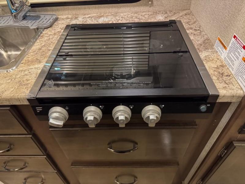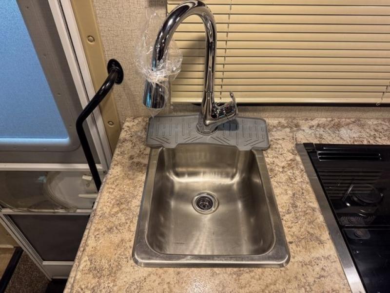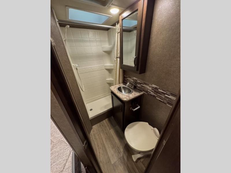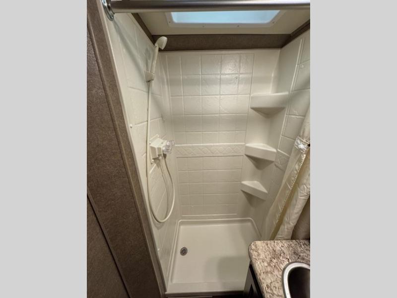 With any Four Winds Class C gas motorhome, you will enjoy the ease of driving and the affordable price. On the interior you will find residential vinyl flooring, high-sheen cabinetry with nickel finish hardware, and laminate countertops which make it easy to clean after a weekend getaway or an extended vacation. The stainless steel bathroom sink and foot flush porcelain toilet provide added convenience every where you stop, and the skylight above the shower is an exceptional feature that brings in the morning sunlight and brightens up the interior.