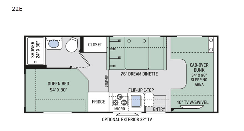 With any Four Winds Class C gas motorhome, you will enjoy the ease of driving and the affordable price. On the interior you will find residential vinyl flooring, high-sheen cabinetry with nickel finish hardware, and laminate countertops which make it easy to clean after a weekend getaway or an extended vacation. The stainless steel bathroom sink and foot flush porcelain toilet provide added convenience every where you stop, and the skylight above the shower is an exceptional feature that brings in the morning sunlight and brightens up the interior.