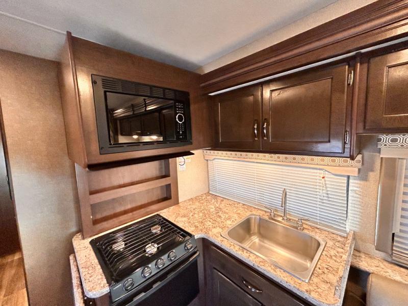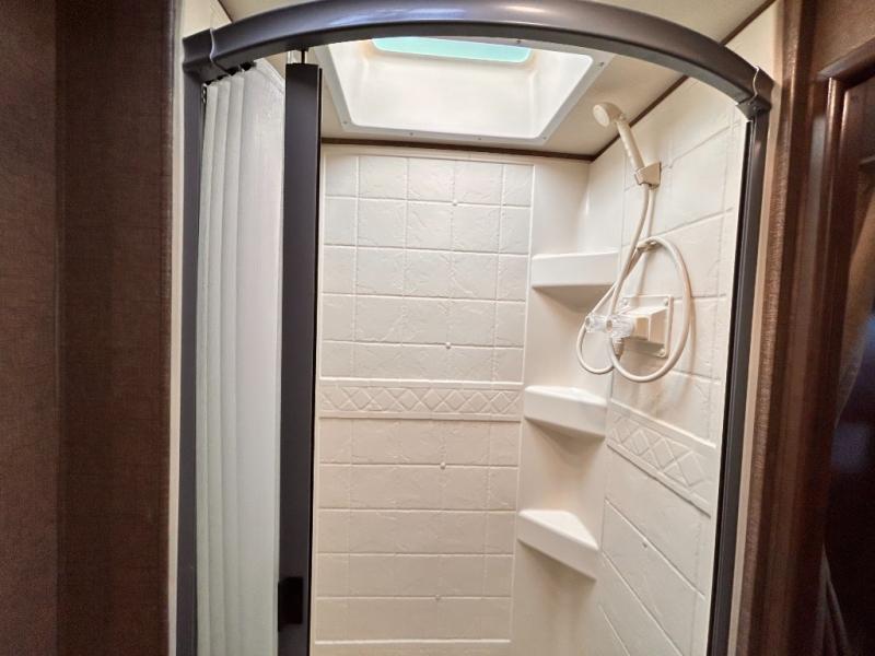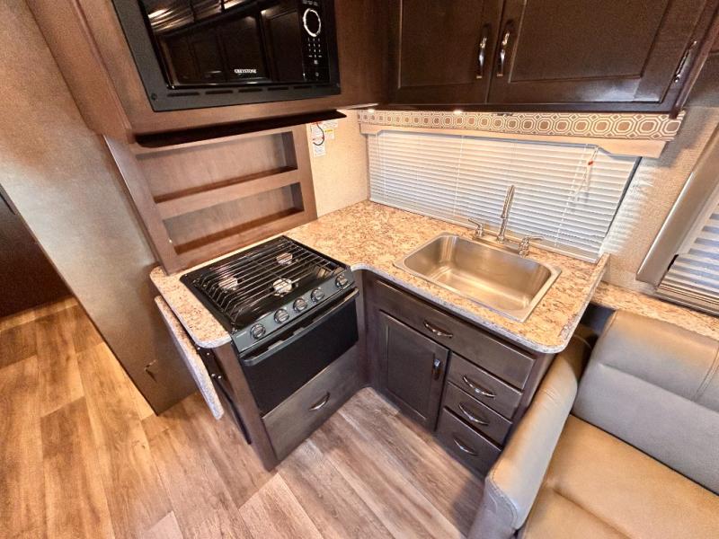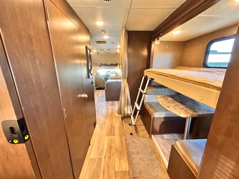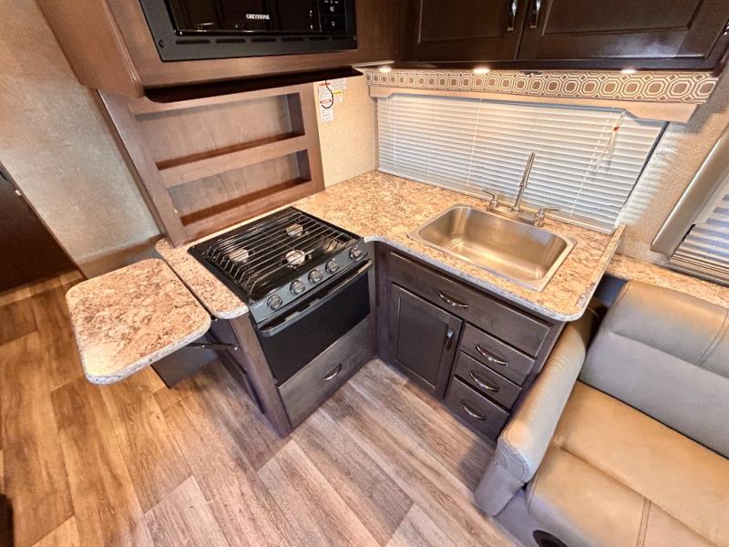 If you are looking for the perfect Class C gas motorhome for a large family, then you need this Four Winds coach! This double slide model includes plenty of sleeping accommodations to sleep nine people with a set of bunk beds, a bunk over the cab, a private bedroom with an RV queen bed, a jackknife sofa, and a Dream Dinette. The interior is also useful for more than just resting each night because it includes both a full kitchen with a three burner range and a flip-up countertop, as well as a full bathroom with a 24" x 36" shower.