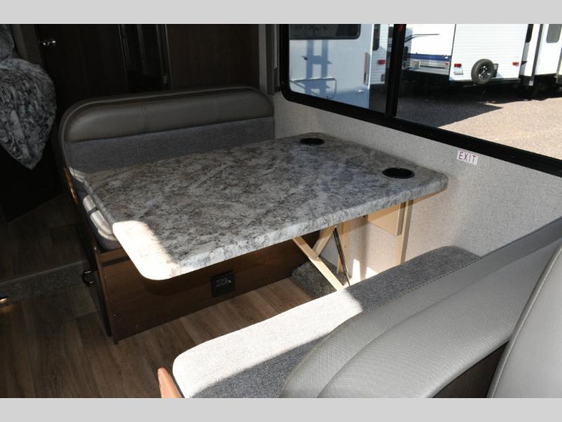 The booth dinette offers a great space for meals, games, or relaxing after a day on the road, and the swivel cab seats extend your living area when parked. -