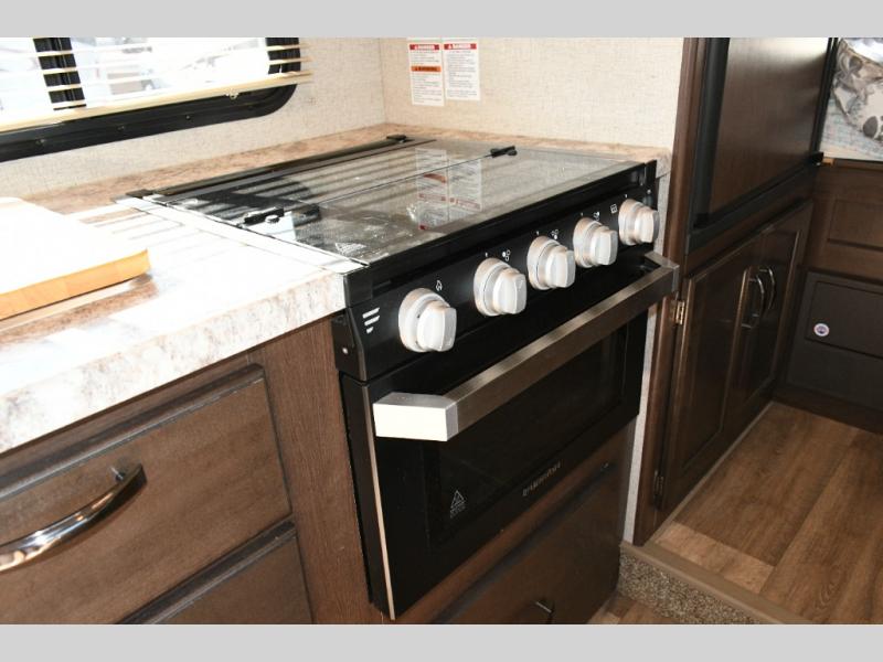 Prepare your favorite meals wherever you roam with a three-burner cooktop, microwave, oven, double-door refrigerator, and deep sink with ample counter space. -