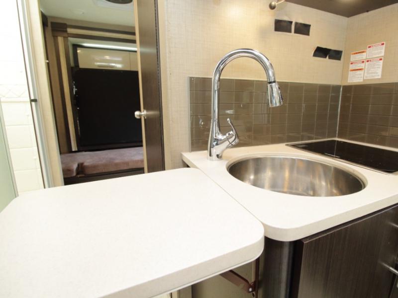 The private rear bedroom features a flip-up full-size bed in the slide-out, maximizing floor space during the day and offering a restful retreat at night. A split bath design ensures easy access and privacy, while the kitchen boasts a countertop extension, Euro-style cabinetry, and durable pressed laminate countertops.
