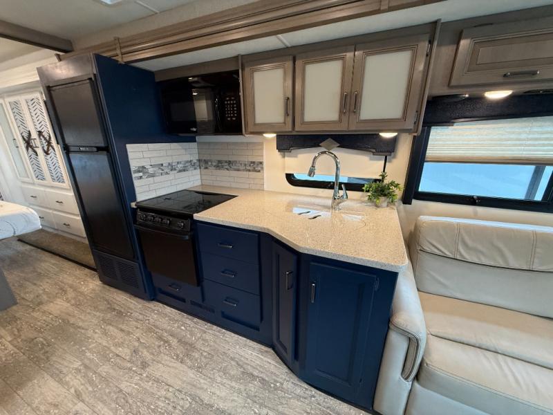 With any Thor Motor Coach Hurricane Class A gas motorhome you will begin with a welded tubular steel frame with a welded tubular aluminum roof and sidewall cage construction. Some exterior features include the one-piece fiberglass front and rear caps, the automatic leveling jacks with Touchpad controls, and the Pet-Link multi-purpose tie-down allowing you to keep your family pet safely near you. More features you are sure to enjoy while on your adventures, the touch screen radio with Bluetooth connectivity, SiriusXM radio, and monitor for your rearview and side view camera, the flip-out workstation, the easy to care for residential vinyl flooring, the Leatherette furniture, the USB charging ports and so much!