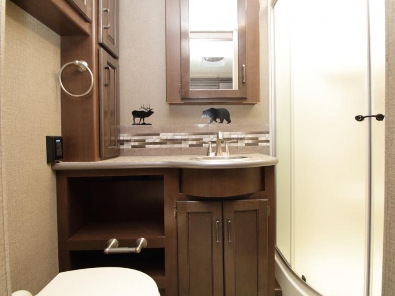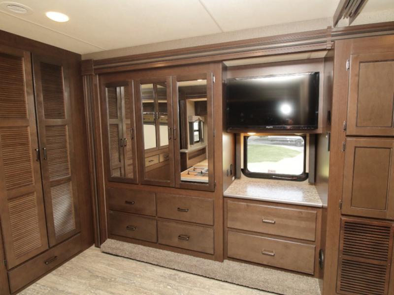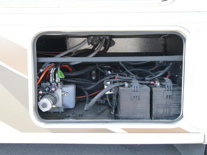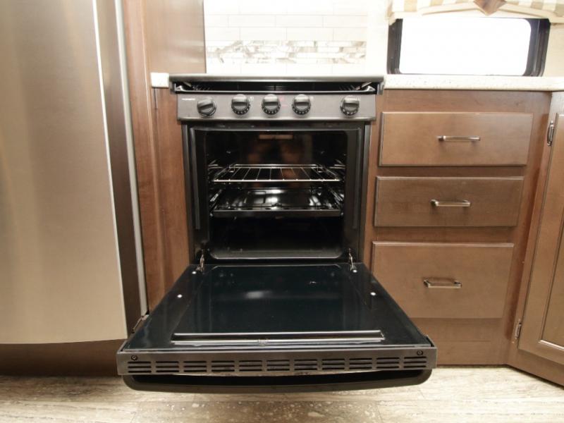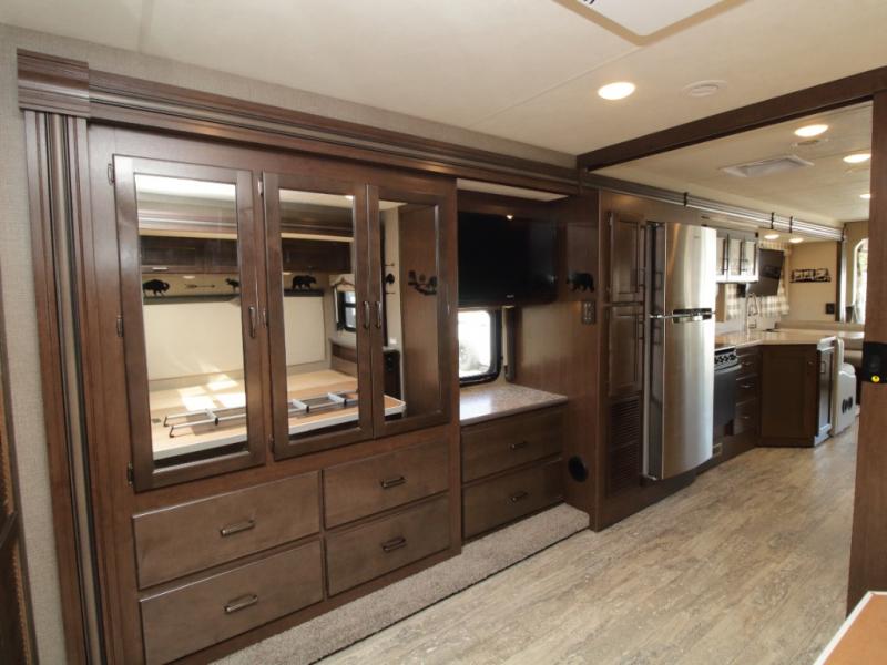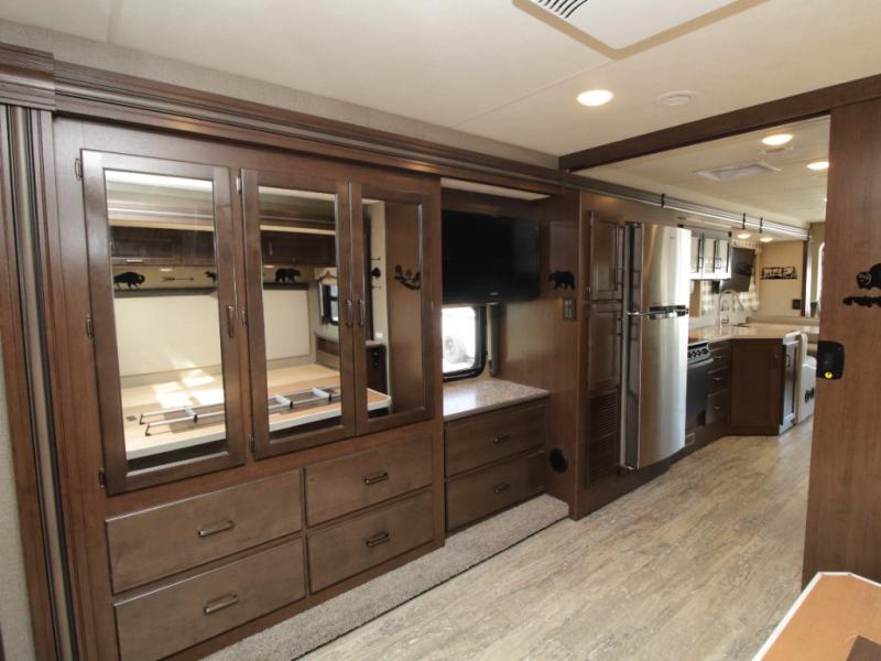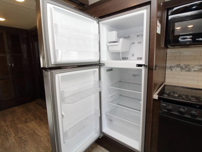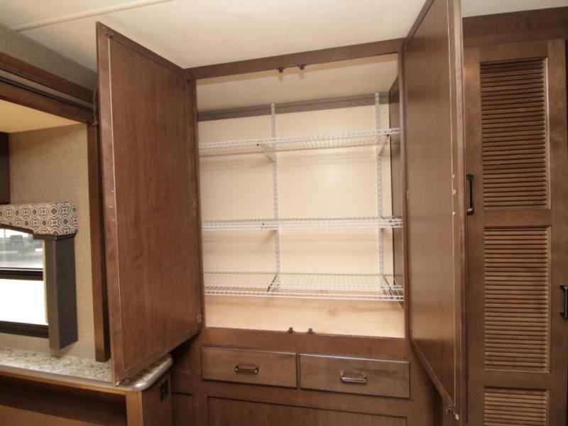 The well-equipped kitchen includes an 11 cu. ft. residential refrigerator with ice maker, pantry, and ball-bearing drawer guides, plus all the appliances you need to cook on the road. Relax indoors with the LED TV, or head outside to enjoy the 32" exterior TV under the power awning.