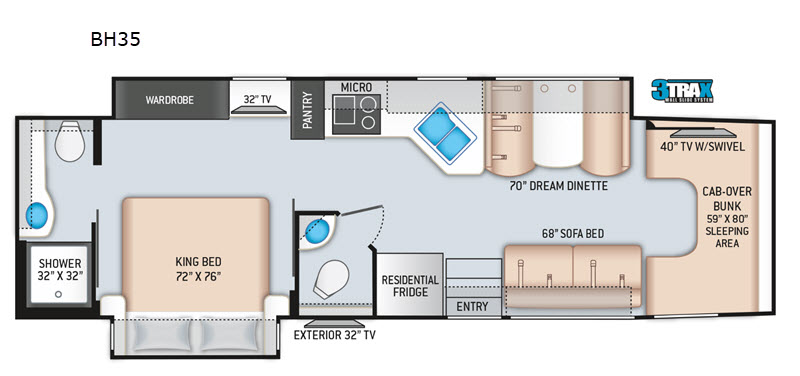 | TV Info | Cab 40" TV, BR 32" TV, Exterior 32" TV |