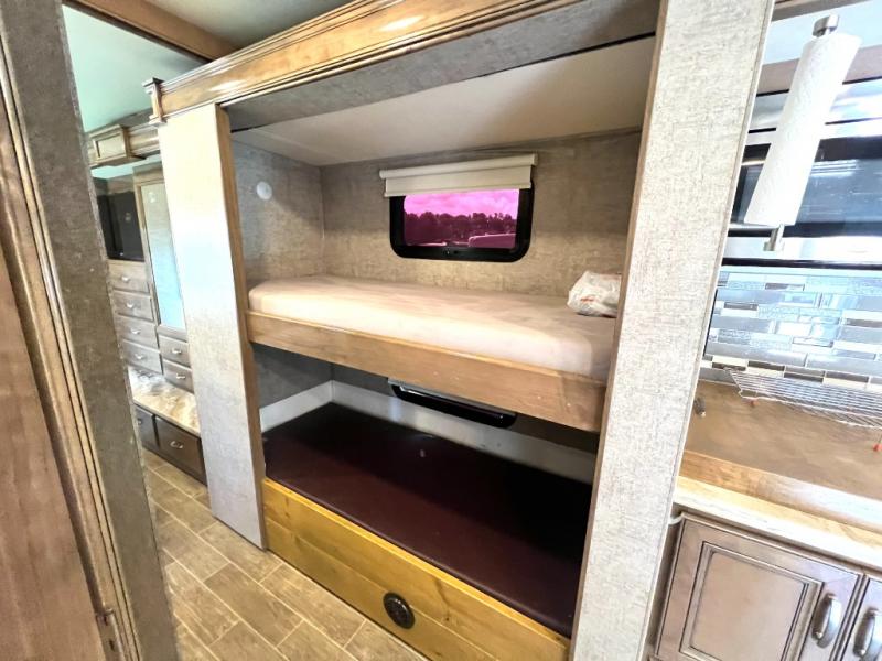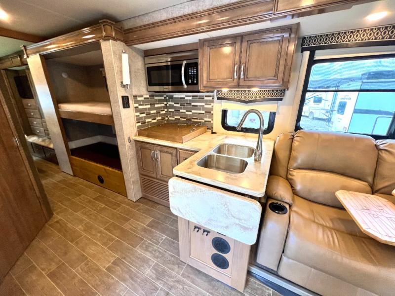 If you're a large family looking to take a fun and comfortable road trip then check out this Omni Super C diesel BB35 motorhome! Your sleeping choices are endless between the 29"x 72" bunk beds, cab over bunk, 74" sofa bed, and the inclining king bed in the rear private bedroom. Inside the private bedroom there is even access to the dual entry bath, along with a wardrobe, a dresser, and a 32" LED TV for your enjoyment. Your meal prep will be a breeze in this kitchen with the flip-up countertop, and you can enjoy your delicious meals at the 70" dream dinette, which can even be transformed into an extra sleeping space at night!