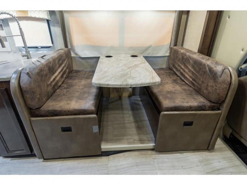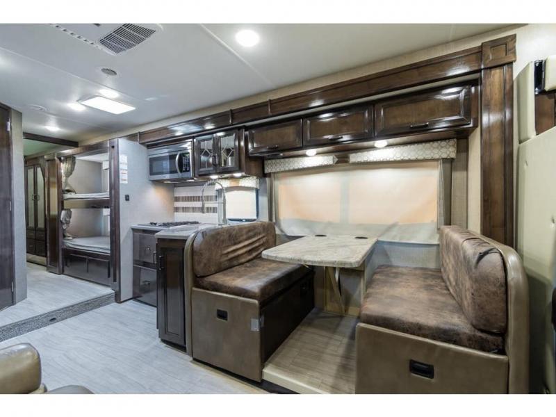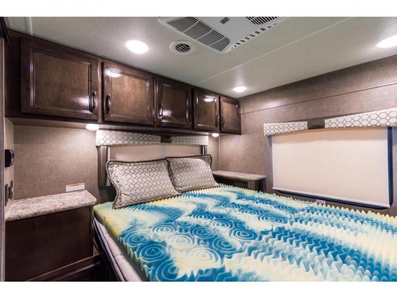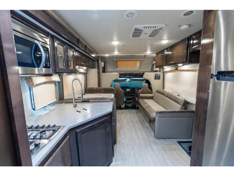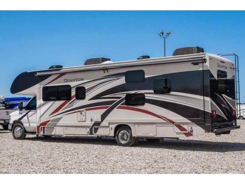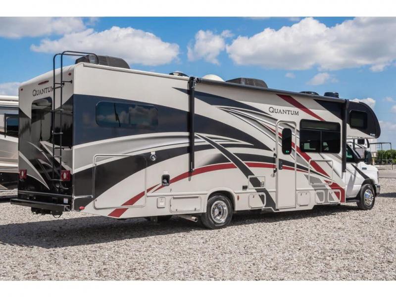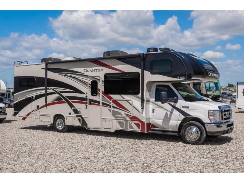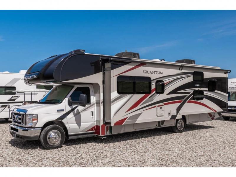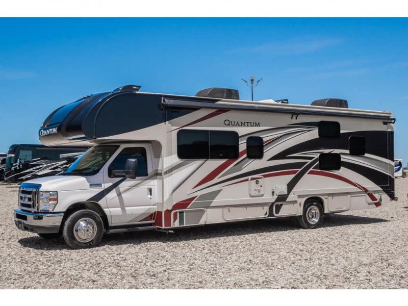 Start your greatest adventure as soon as the tires hit the road in any one of these Thor Motor Coach Quantum Class C gas motorhomes! The welded tubular steel floor, the Ford E-series chassis, and the vacu-bond laminated roof, walls, and floors with block foam insulation ensure that you will have years of enjoyment. You will also enjoy all of the convenient features throughout the interior like the touchscreen dash radio with navigation and a back-up monitor to keep you safe on the road. With solid surface countertops, high-gloss solid wood cabinetry, and LED lighting, you will feel right at home. And for your safety, there are smoke, LPG, and carbon monoxide detectors, as well as a fire extinguisher. So get on the road to adventure today with a Quantum Class C gas motorhome by Thor Motor Coach!