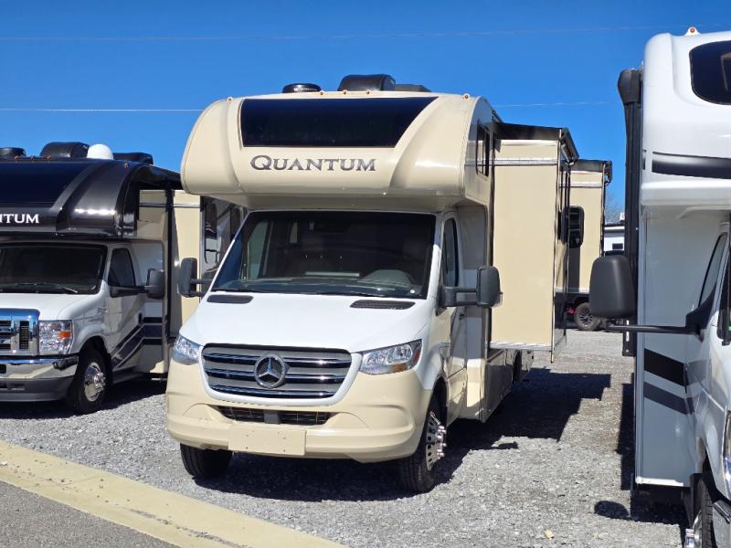 Built on a Mercedes-Benz chassis, the Quantum Sprinter Class C diesel motorhome by Thor Motor Coach was built with your comfort in mind. Each model includes lighted rotocast storage compartments for all your gear, a power patio awning with integrated LED lights to create an outdoor living space, and a fiberglass front cap with a skylight and power shade. Inside, you'll enjoy residential vinyl flooring, an 84" ceiling height for more standing space, a double-door refrigerator, a convection microwave, and many more features. You'll love the Platinum Package which comes standard and includes a touchscreen dash radio with navigation and back-up monitor, stainless steel wheel liners, solid surface countertops, premium window privacy roller shades, and an outside shower!