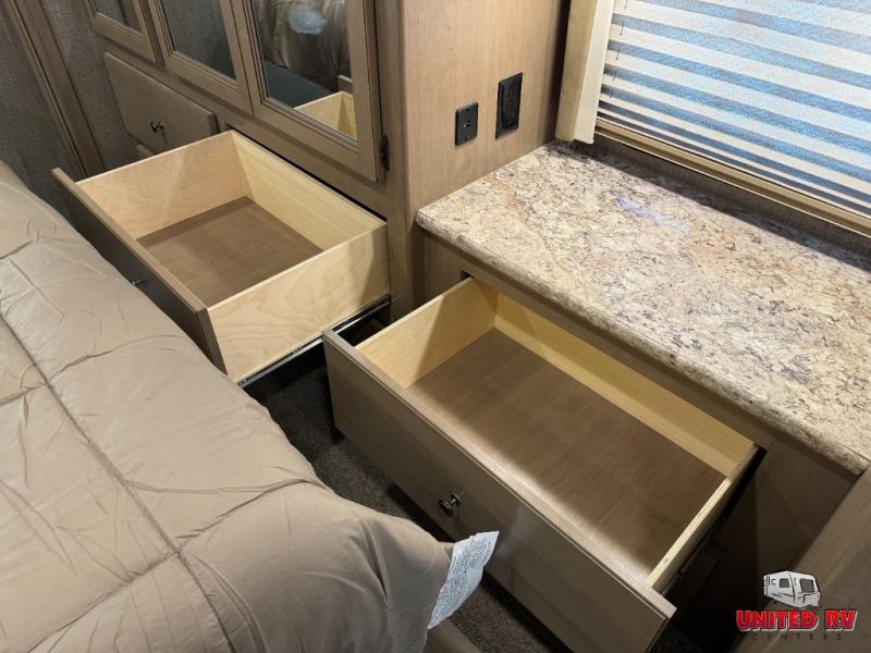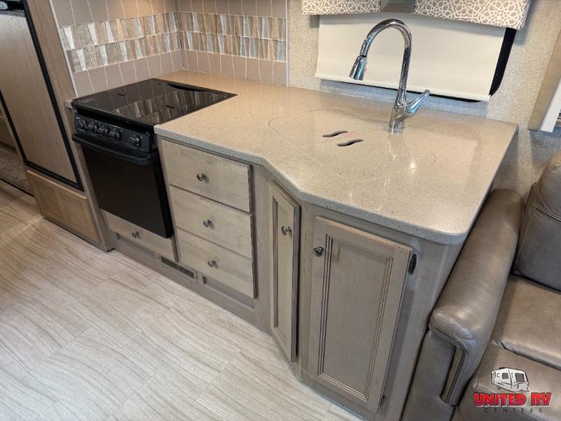 You will find there is much to love about the Thor Motor Coach Windsport Class A gas motorhomes, whether you are out for a long road trip across the country or a weekend reunion with family. All Windsport models feature Leatherette furniture, solid surface kitchen countertops, and raised panel upper cabinet doors with nickel finish hardware and glass inserts on select doors. With the swivel and reclining captain's chairs featured in these coaches, you can easily bring them into the conversation area in the living space once parked. Each unit includes a dash workstation with 110-volt and 12-volt outlets at the passenger side for those who need to take work with them on the road or for those who just enjoy surfing the internet. On the outside, enjoy Rotocast storage compartments, an outdoor shower, and a legless lateral power awning with integrated LED lighting.