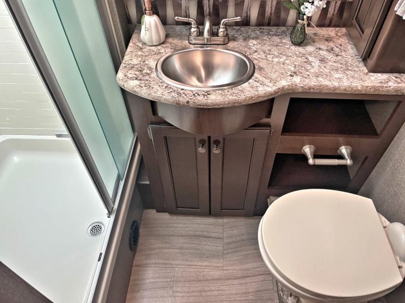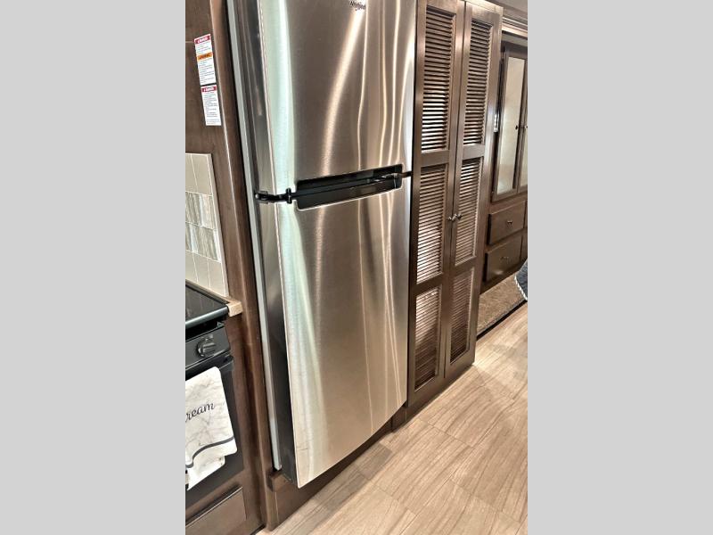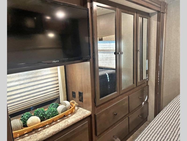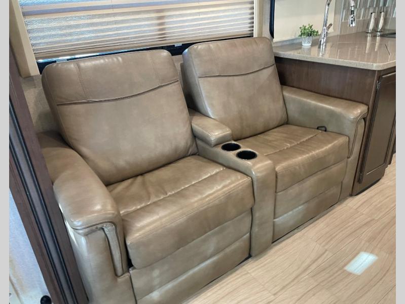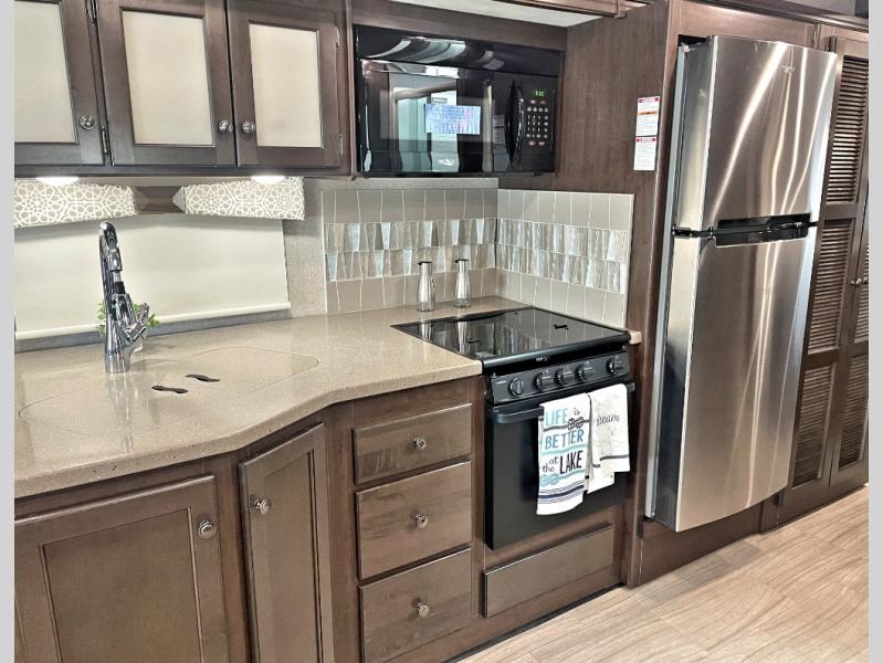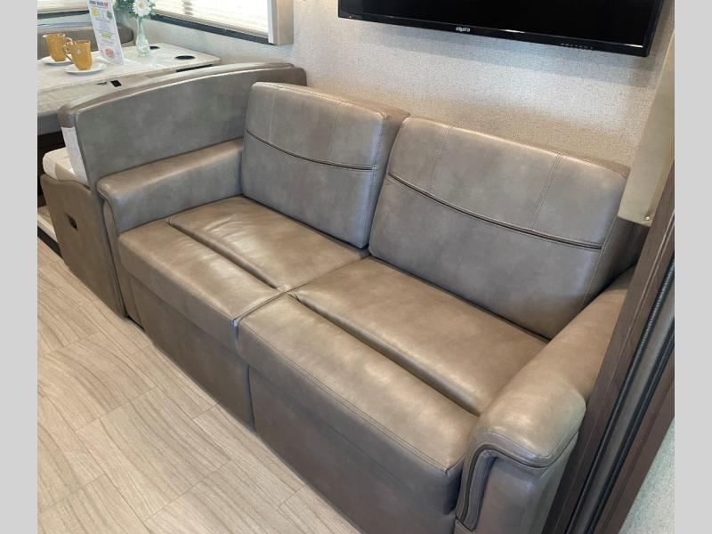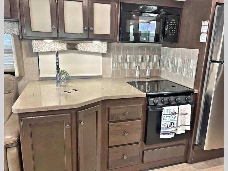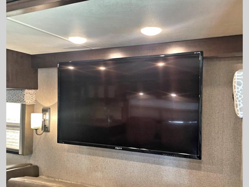 This Windsport Class A gas motorhome features a spacious interior thanks to a full-wall slide and a second slide on the opposite side. With all the furniture, plus theater seating with footrests, you and your family will enjoy any day inside. The full kitchen and complete bath make your journey that much more enjoyable allowing you to choose to keep moving down the road or stopping for a break. The exterior 32" LED TV and 18' awning with LED lighting make it fun to entertain in the evening outdoors. When it's time to turn in for the night, there is sleeping space for seven to eight people including the master bedroom's RV king bed!