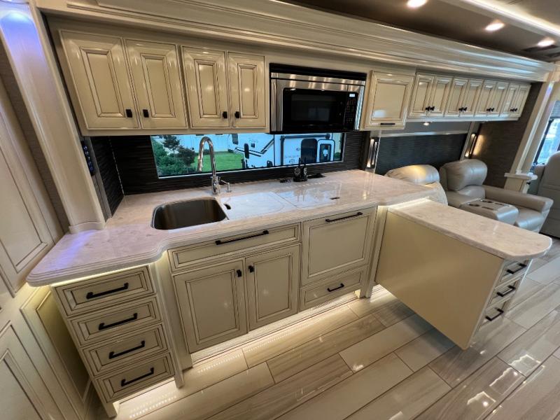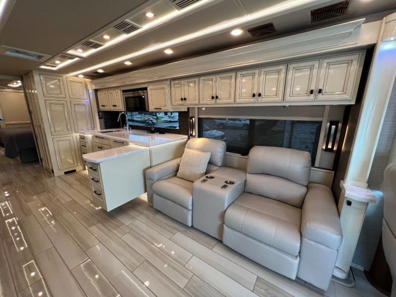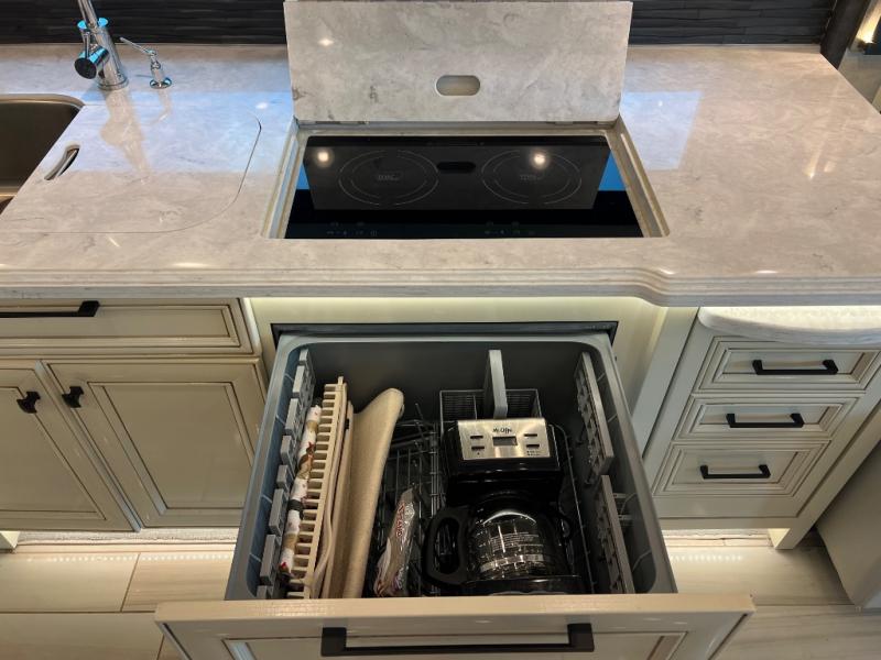 When you've been dreaming of the open road, choose this Allegro Bus Class A diesel motorhome to make your dreams a reality. You'll love the space you have thanks to the four slides, and your family will have plenty of seating space on the sofa bed with an ottoman, the Ultraleather sofa bed with a lift TV, or at the dinette with a computer workstation. Mom and dad will love the master suite that includes a TV, dual bath sinks in the full bath, and a floor-to-ceiling closet that allows you to bring all of your belongings along. The chef of the family will love cooking in this kitchen that features a two-burner induction cooktop, an extend-an-island for more counter space, a residential refrigerator, and two pantries for all the dry goods.