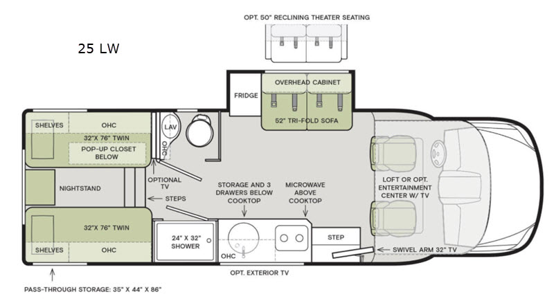 Plan a trip across states in this motorhome that will comfortably sleep five to six people each night. The bunk above the cab will be great for the kids or you can choose the optional entertainment center with a TV if you don't need extra sleeping space. You can relax on the tri-fold sofa and watch the news on the swivel arm 32" TV while the chef of the family prepares lunch on the two burner LP cooktop. There is also a convection microwave for when you're on-the-go. Step down into the rear bedroom where you'll find two twin beds with a pop-up closet below one of the beds for extra blankets or board games. This model also includes a pass through storage that will be great for your lawn chairs and you can add an optional exterior TV if you're wanting to watch the big game outdoors!
