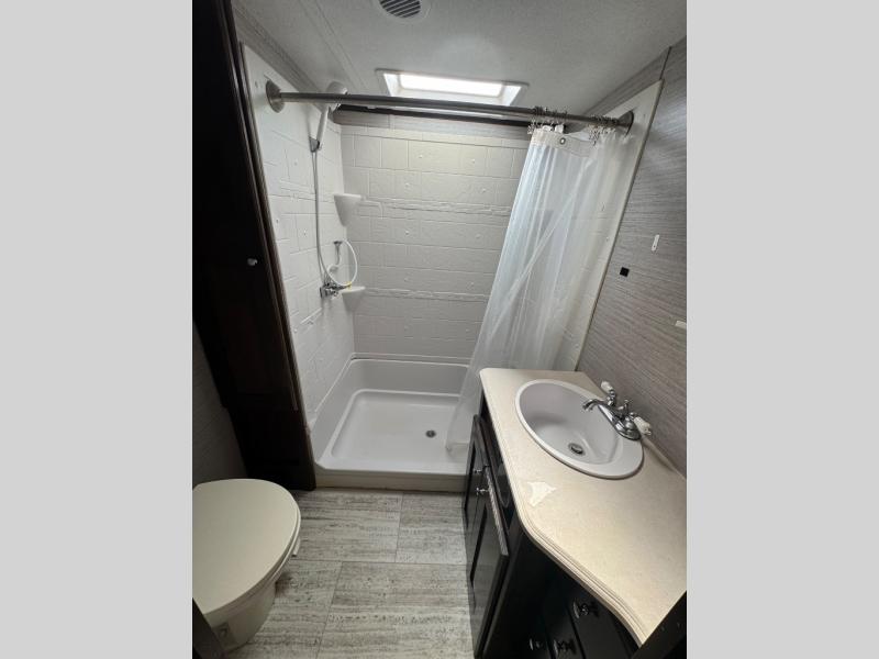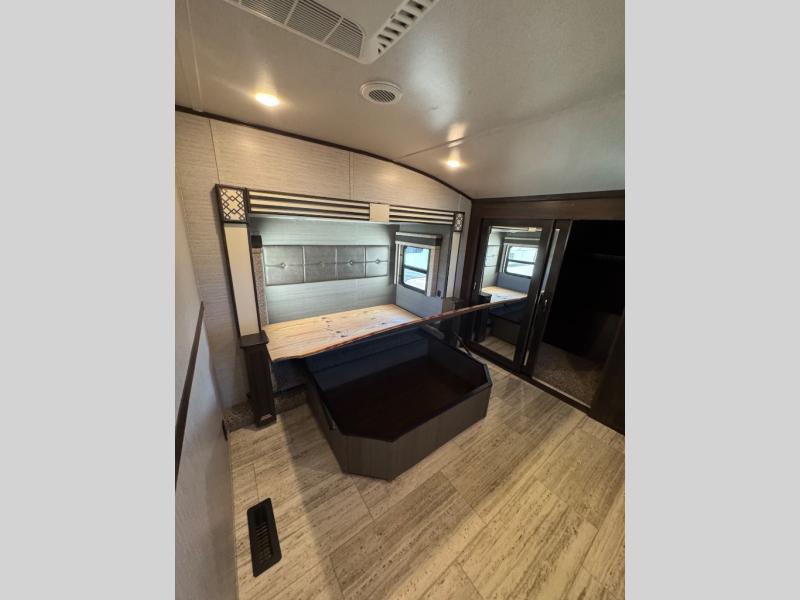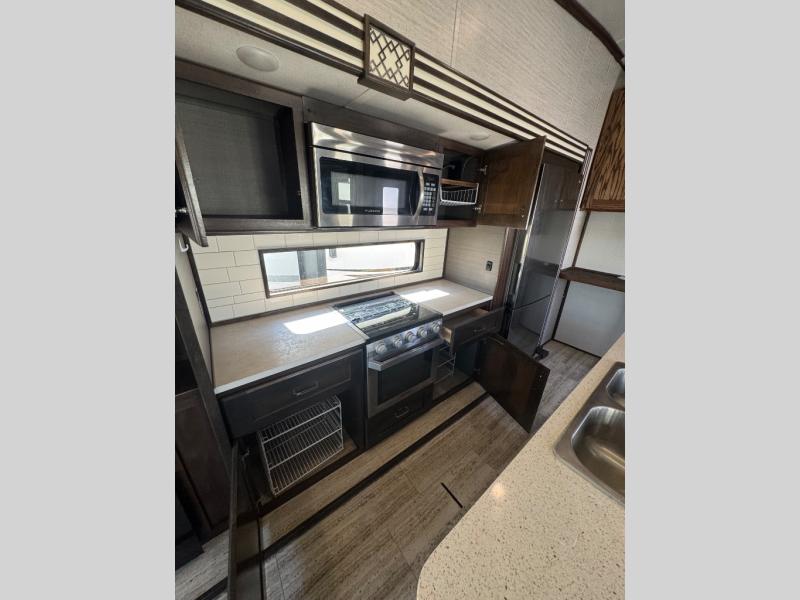 Prepare to be amazed by the stunning interior, the luxurious accommodations, and the innovative features found in each of the Pinecrest fifth wheels from VanLeigh RV! Each model features beautiful real wood doors and fascia legs handcrafted in house along with solid wood drawers and drawer fronts. The rigid Congoleum flooring will be easy to clean and the chef of the family will love cooking in the Pinecrest kitchen with its residential appliances and galley window for a view outdoors. And since these models feature 4-point electric auto leveling verses electric scissor jacks, you can set up camp in no time!