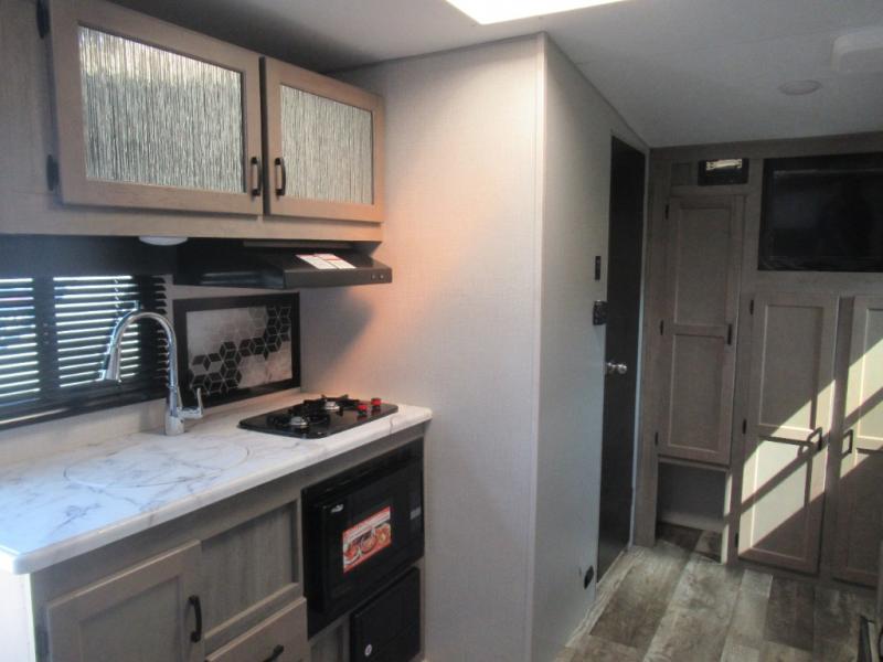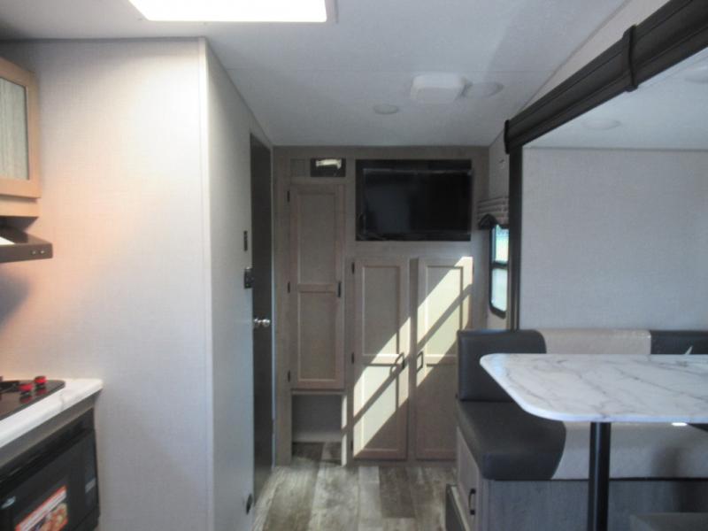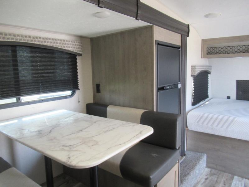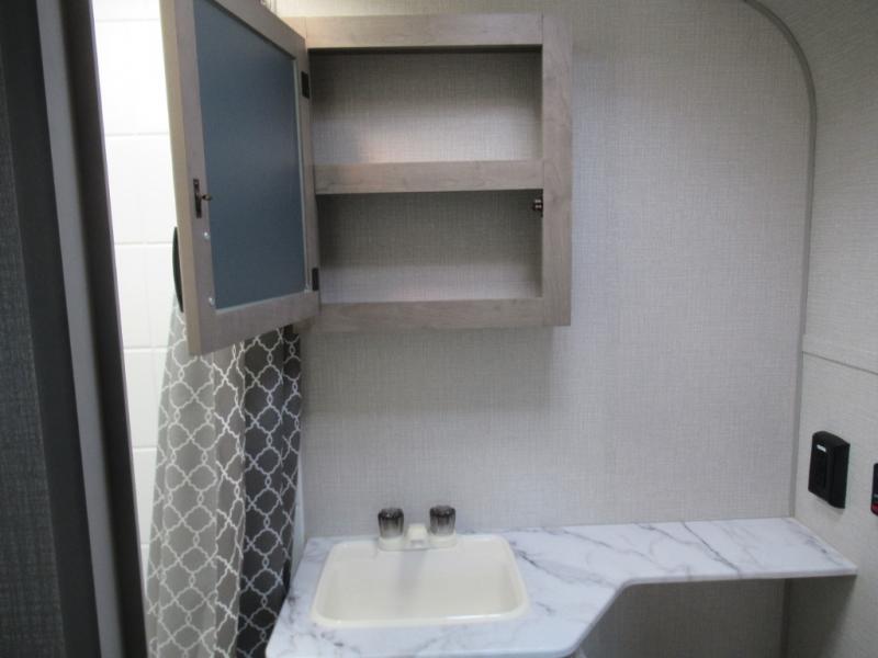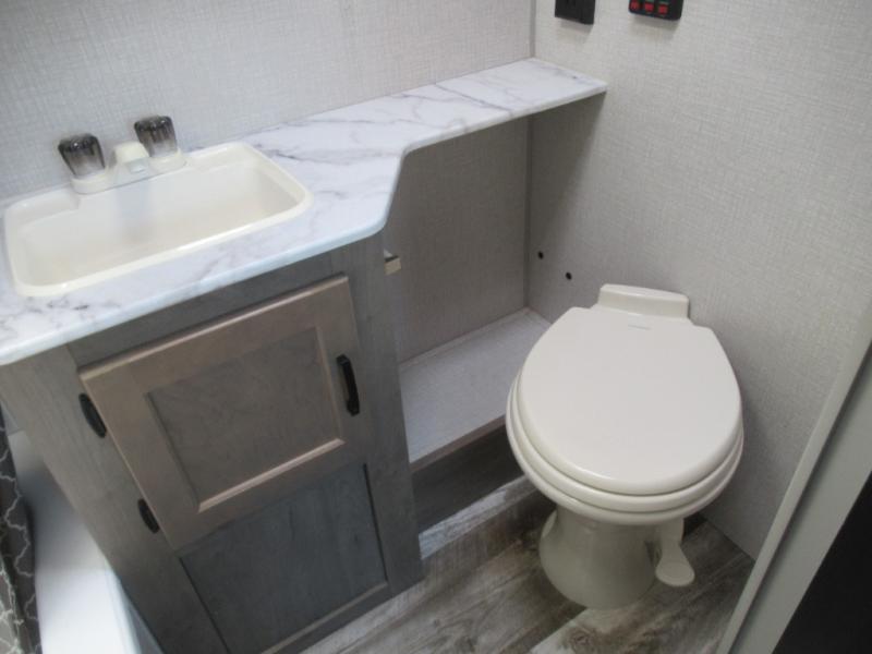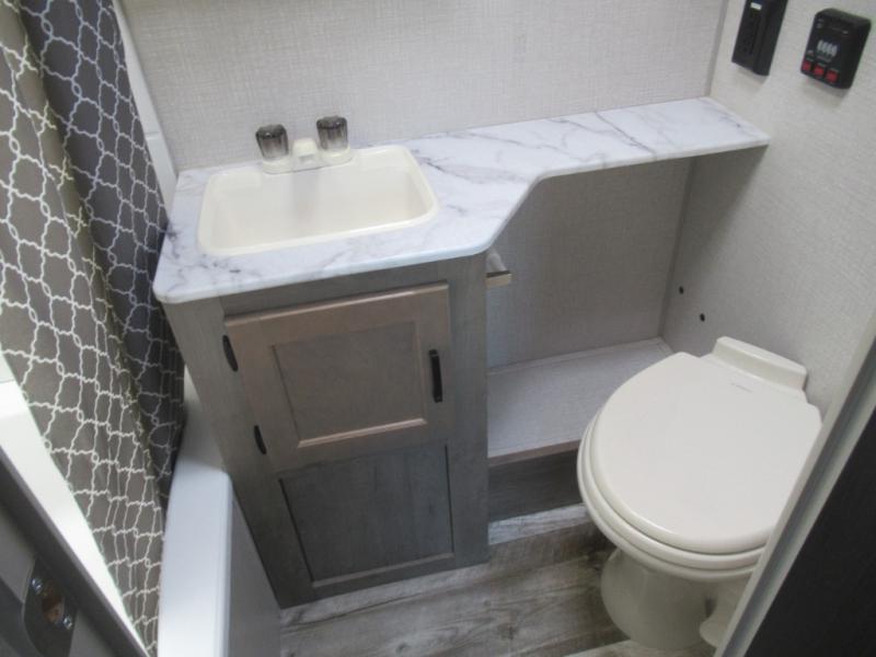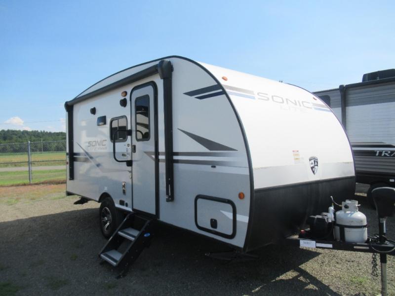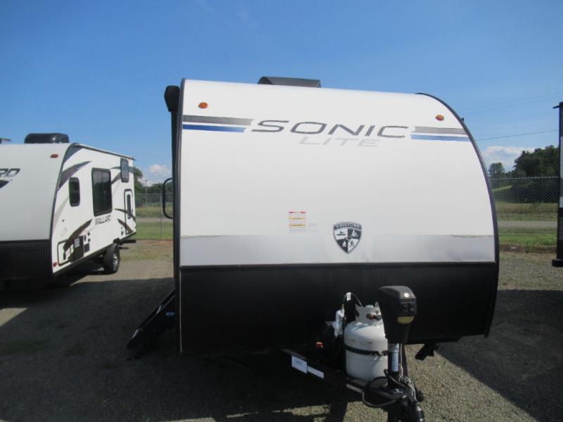 Hop into this Sonic Lite travel trailer when you're ready to experience a relaxing camping adventure with your spouse! It features a front 60" x 75" bed for you to enjoy a good night's rest on and USB chargers for you to keep your electronics fully charged. Next to the full bathroom in the back is the entertainment center with a pantry for you to grab a snack and head to the 65" x 48" booth dinette to enjoy meals and play games. Grab a chair from the exterior large pass-through storage area and head underneath the 12' power awning with LED lights to enjoy breathing in the fresh air without getting a sunburn!