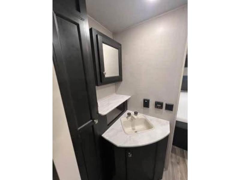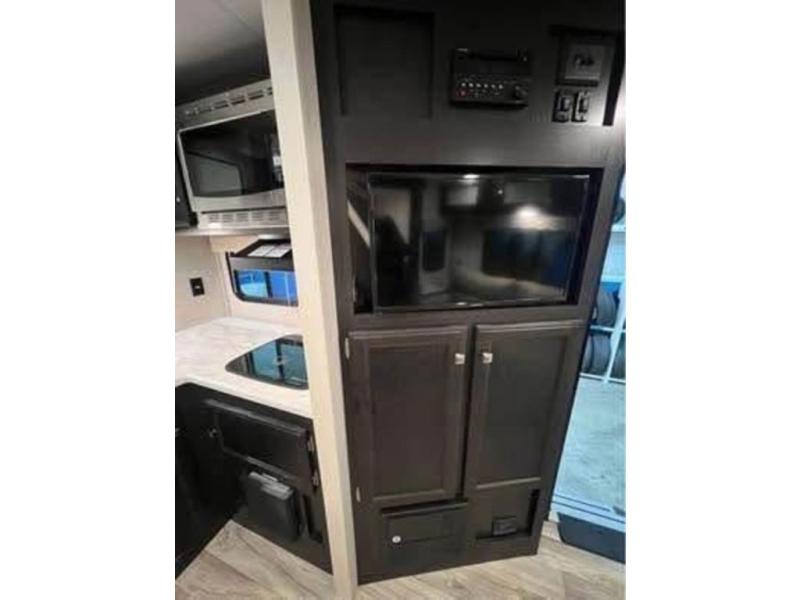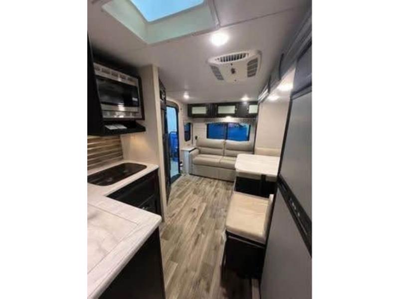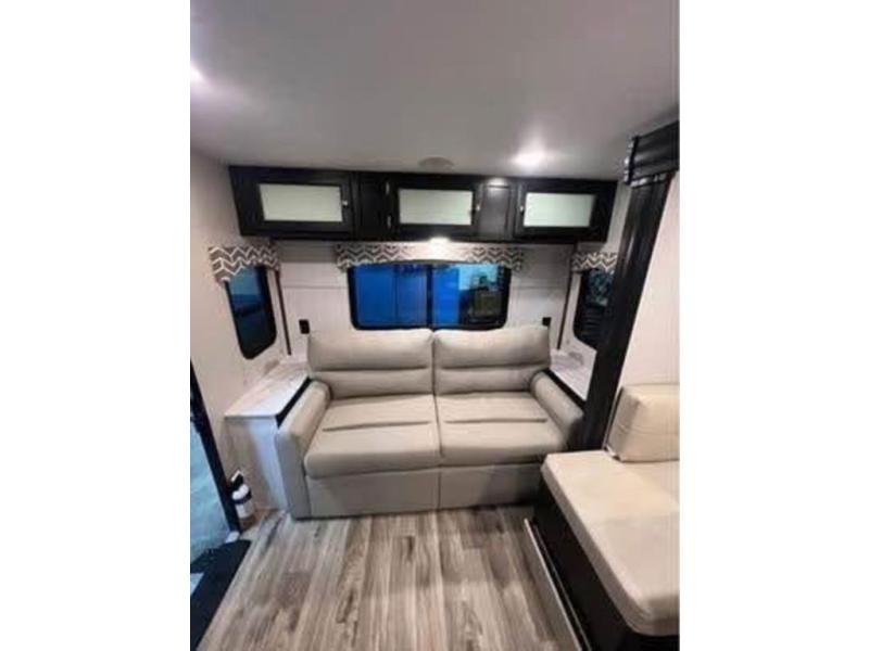 Looking for a couples trailer with extra sleeping space for the grandkids? You'll enjoy your own front private bedroom, while your guests sleep on the jiffy sofa and booth dinette. The cook will surely love the kitchen that features a two burner cooktop, and a 7 cu. ft. refrigerator that can hold your food for the week. You might like to relax under the 17' power awning after being in the sun all day, and take a shower in the walk-through bathroom just before bedtime. There is more to see, take a look!