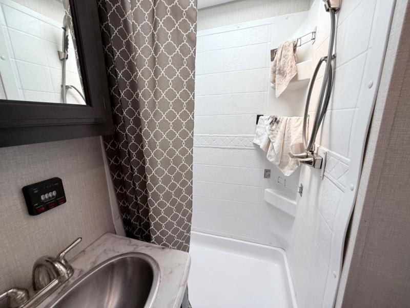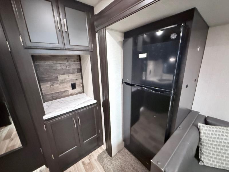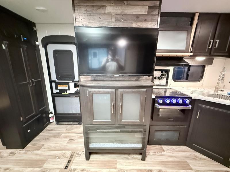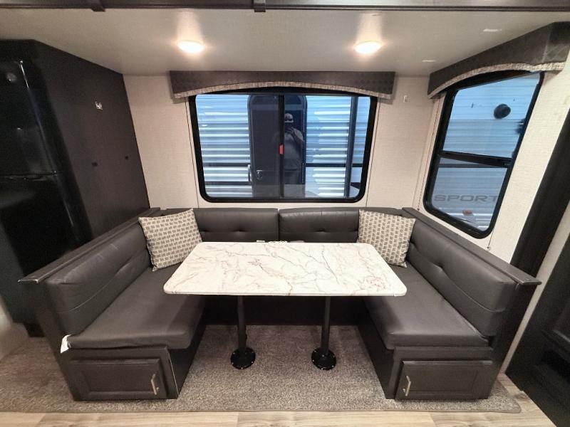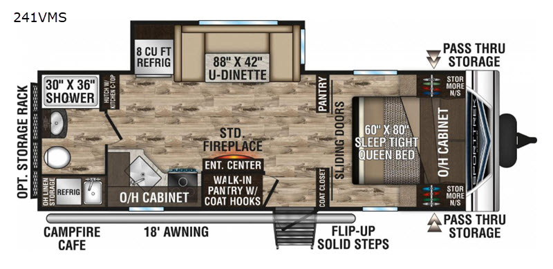 Throughout all of your adventures, nothing will be more helpful than this SportTrek travel trailer! Not only is the interior full of amenities that will allow you to live comfortably, like a private bedroom up front with sliding doors and a 30" x 36" shower in the rear bathroom, but this trailer also comes with extra features that are simply fun, like a fireplace, an entertainment center, and a skylight with shade. Another great addition is the outdoor campfire cafe! You can host summer barbecues with the neighbors or simply grab a cold drink while you are outside playing games.