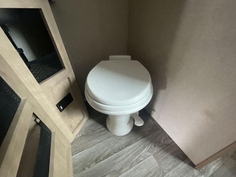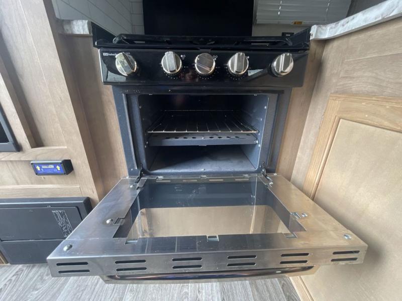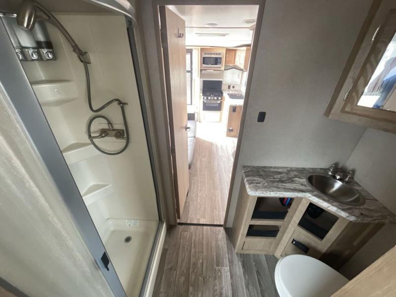 This Winnebago Industries Micro Minnie fifth wheel features a walk-through bath for your convenience! It has a shower, a toilet, and an angled sink with extra counter space, plus there is a wardrobe located just outside of the bath right next to the sofa. Across from the sofa is a booth dinette for you to enjoy your meals at and an LED TV/pantry for your entertainment and snacks all in one place. The rear kitchen has a flush-mount three-burner range with an oven, overhead cabinets, and a double sink for your cleanup to be a breeze, plus extra counter space for an easier prep area!