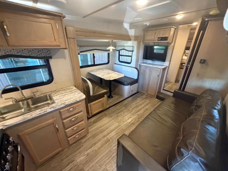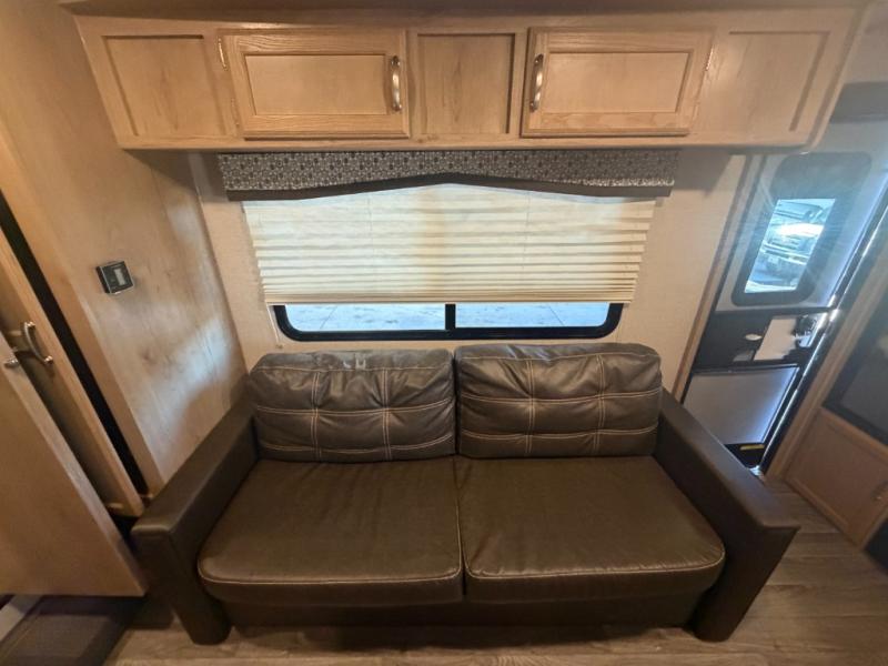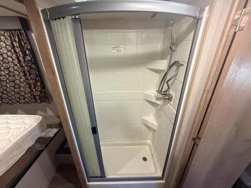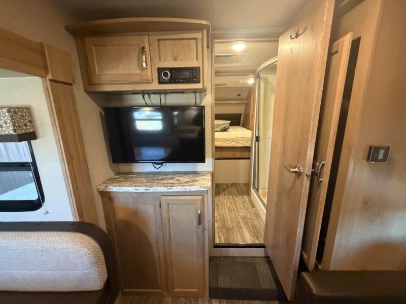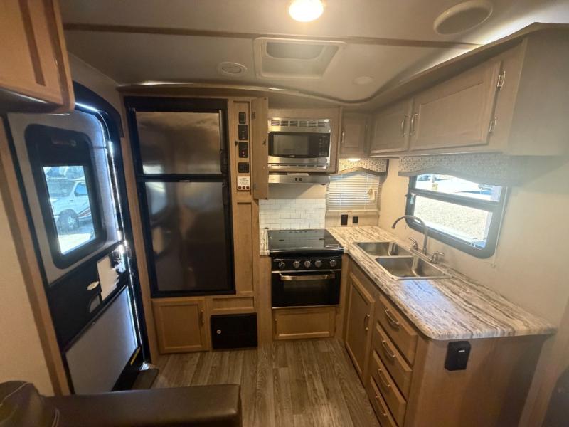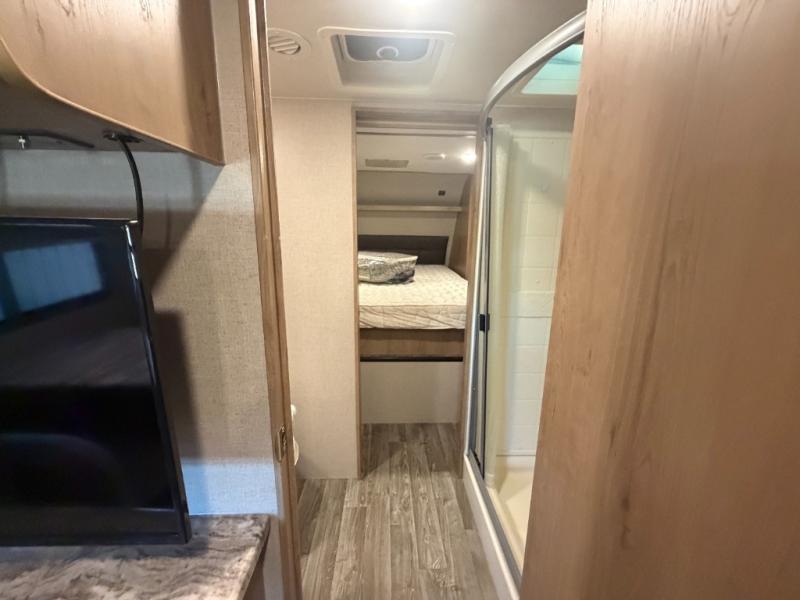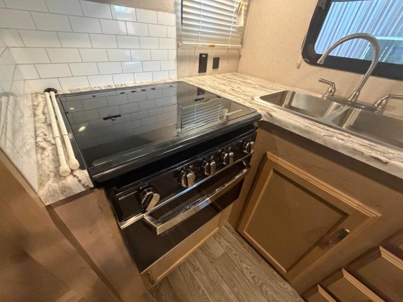 This Winnebago Industries Micro Minnie fifth wheel features a walk-through bath for your convenience! It has a shower, a toilet, and an angled sink with extra counter space, plus there is a wardrobe located just outside of the bath right next to the sofa. Across from the sofa is a booth dinette for you to enjoy your meals at and an LED TV/pantry for your entertainment and snacks all in one place. The rear kitchen has a flush-mount three-burner range with an oven, overhead cabinets, and a double sink for your cleanup to be a breeze, plus extra counter space for an easier prep area!