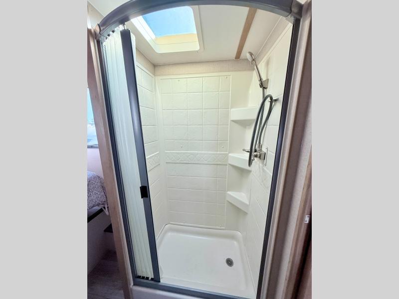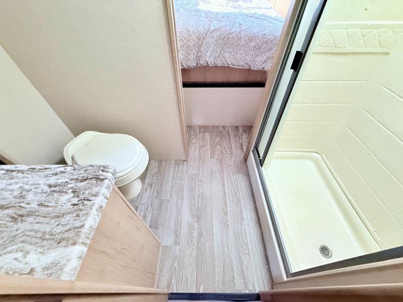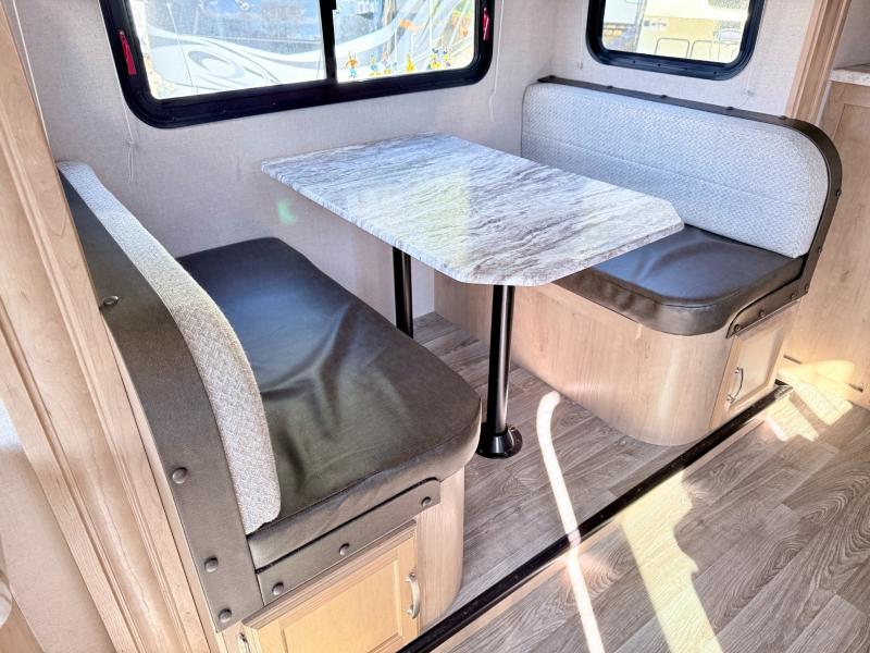 Camping in this Winnebago Industries Micro Minnie fifth wheel will be your best experience yet! It features a front private bedroom that has a queen bed with wardrobes on either side and an entrance into the walk-through bath. Inside the bathroom, there is a shower, a toilet, and a vanity sink with extra counter space. Just outside to the right of the bathroom is a pantry and a booth dinette for you to enjoy your meals at. At the rear of the unit is a sofa with an end table, or you can choose to switch it out for the optional theater seating!